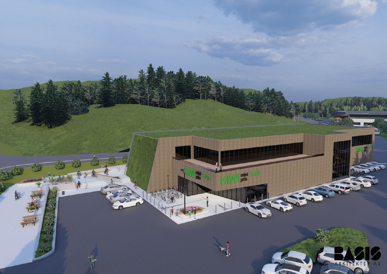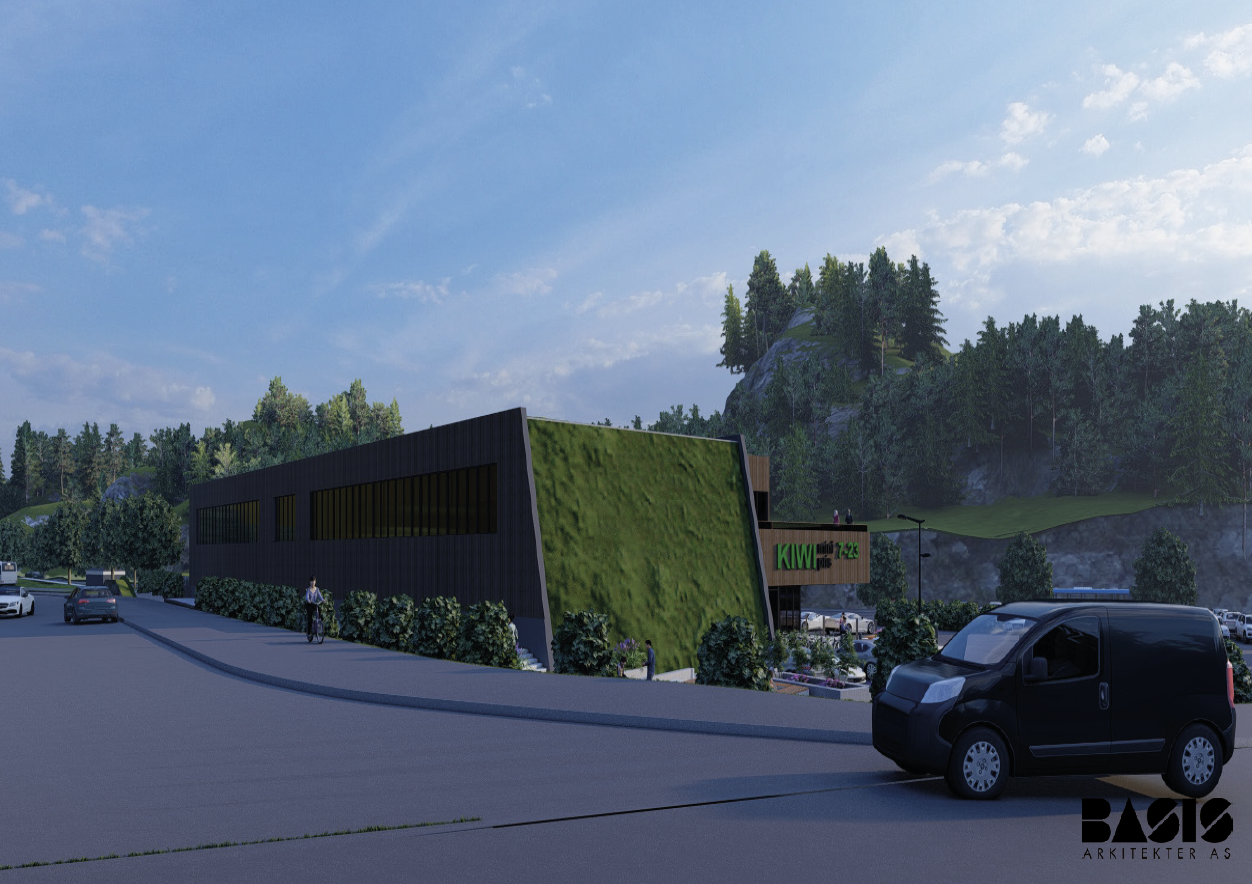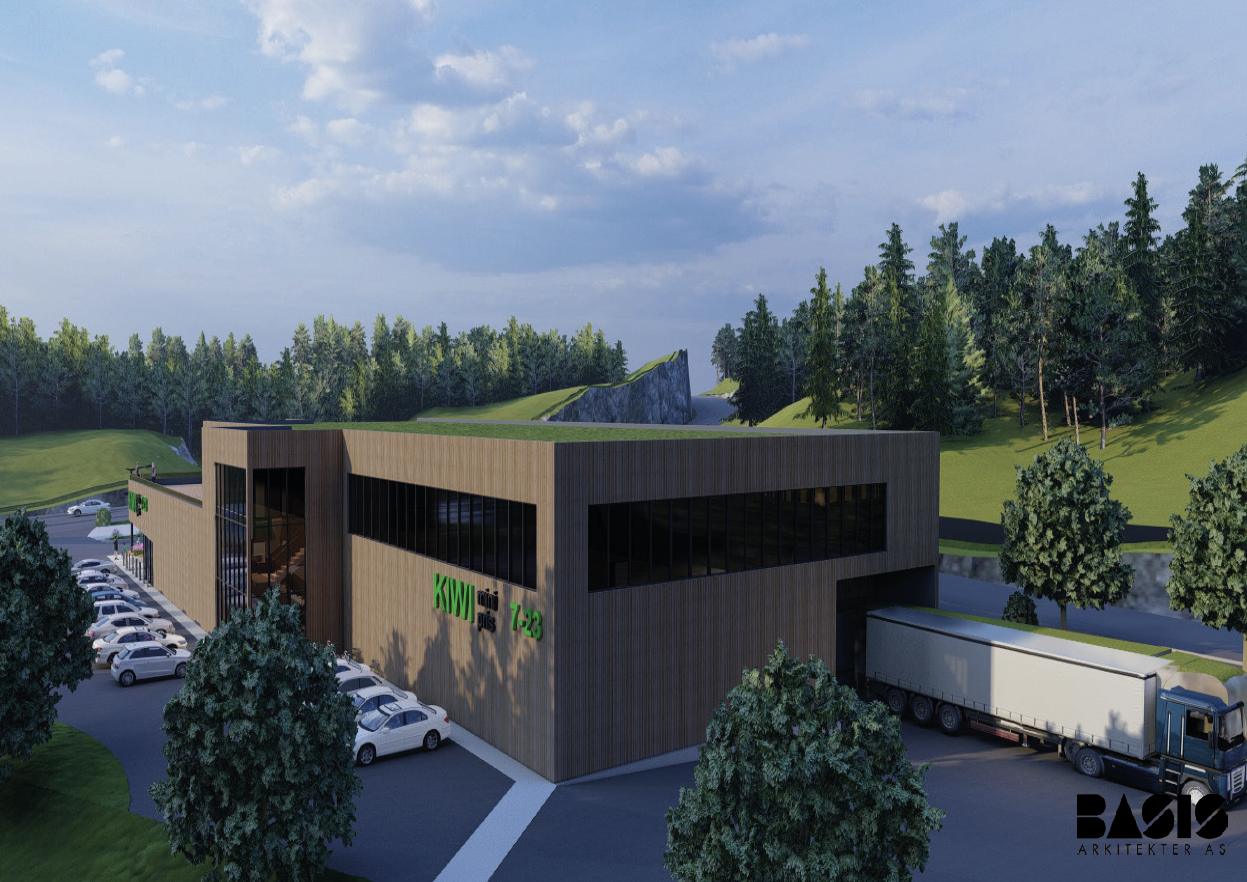 Nedenfor vises illustrasjonsfoto fra Kiwi-bygget av Basis Arkitekter AS.