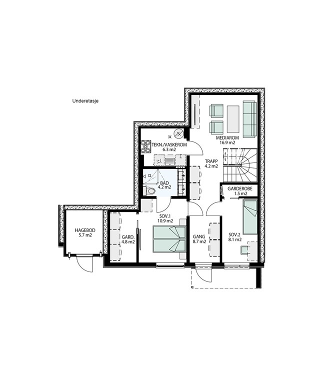 solfylt veranda. Tar du trappen ned vil du finne en tv-stue, to soverom med tilhørende garderober, hvor det ene også har et tilknyttet bad, og et separat vaskerom. I tillegg har etasjen en utgang til hagen med tilhørende utvendig redskapsbod. Boligen har også carport som kan omgjøres til garasje hvis ønskelig, samt en sportsbod i tilknytning til denne.