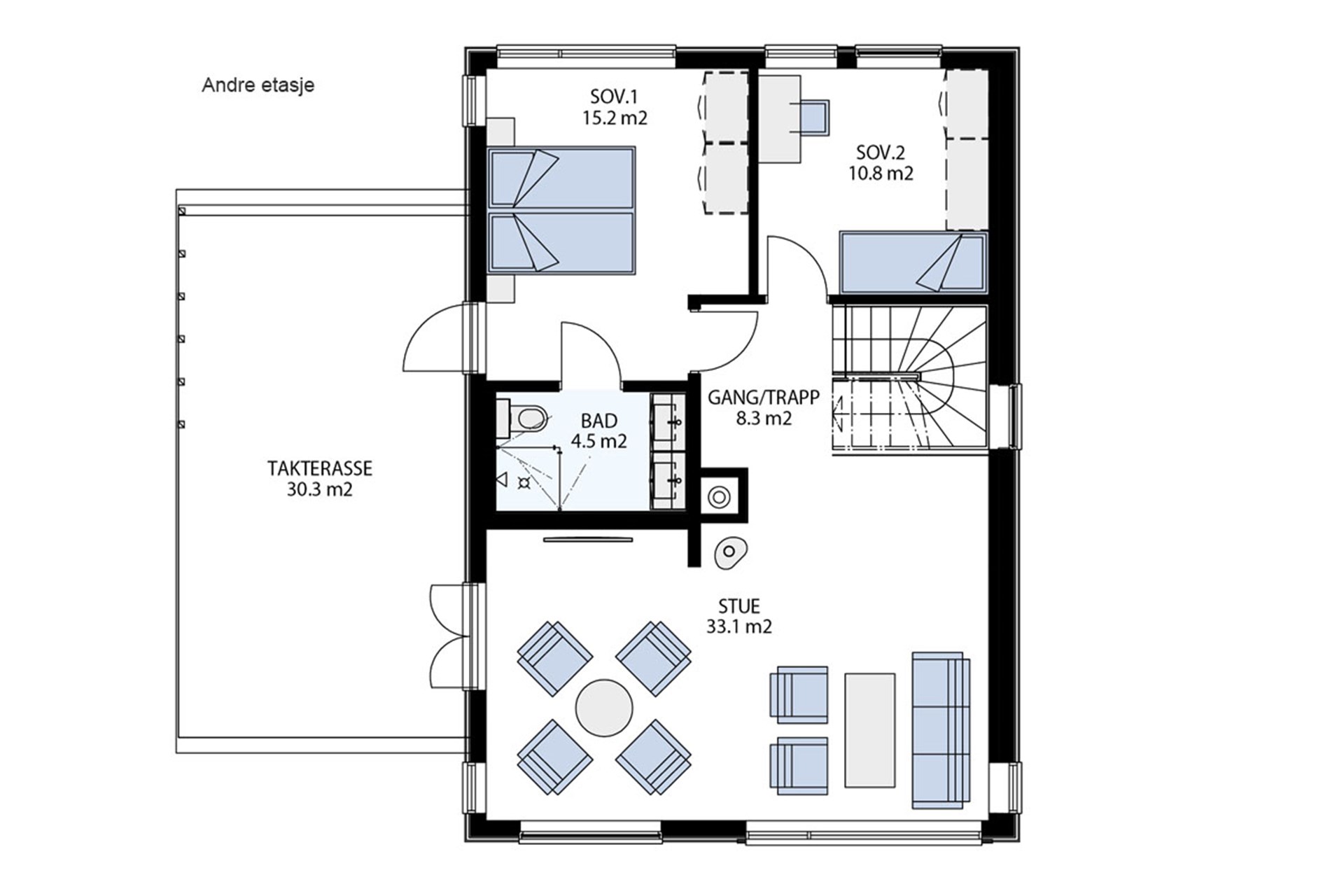 Hoveddel av bolig består av entré, 3 soverom, to bad, separat vaskerom, kjøkken, to stuer og gode oppbevarings muligheter. Du får markterrasse og veranda i hovedetasjen, og en fantastisk usjenert takterrasse i 2. etasje. Boligene vil også ha carport med sportsbod, redskapsbod og en ferdig opparbeidet hage. Carporten kan om gjøres til en lukket garasje dersom det er ønskelig etter nærmere avtale.