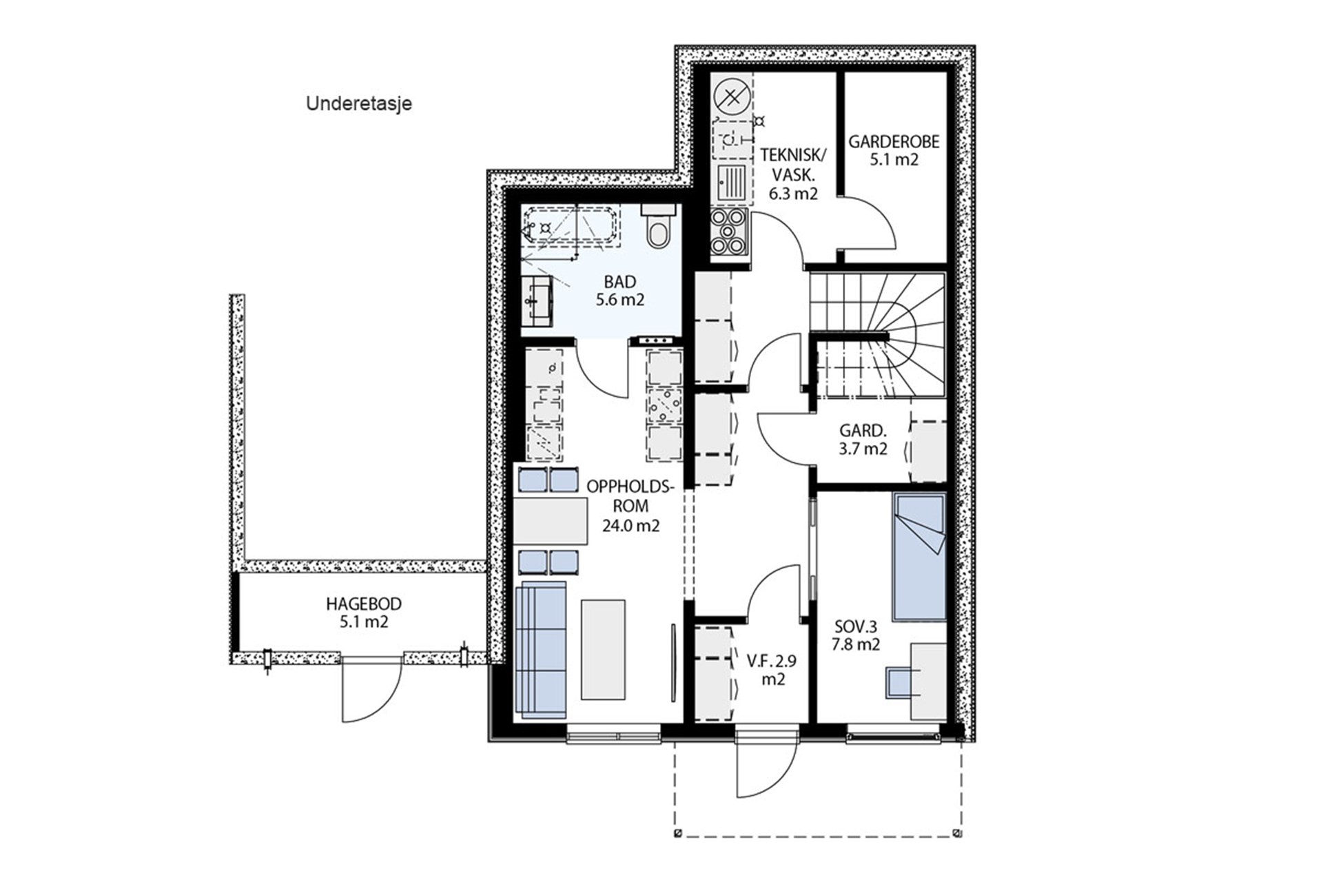 Praktikantdel i underetasjen vil ha en avdeling med eget vindfang, soverom, garderobe, oppholdsrom med kjøkken og separat bad.