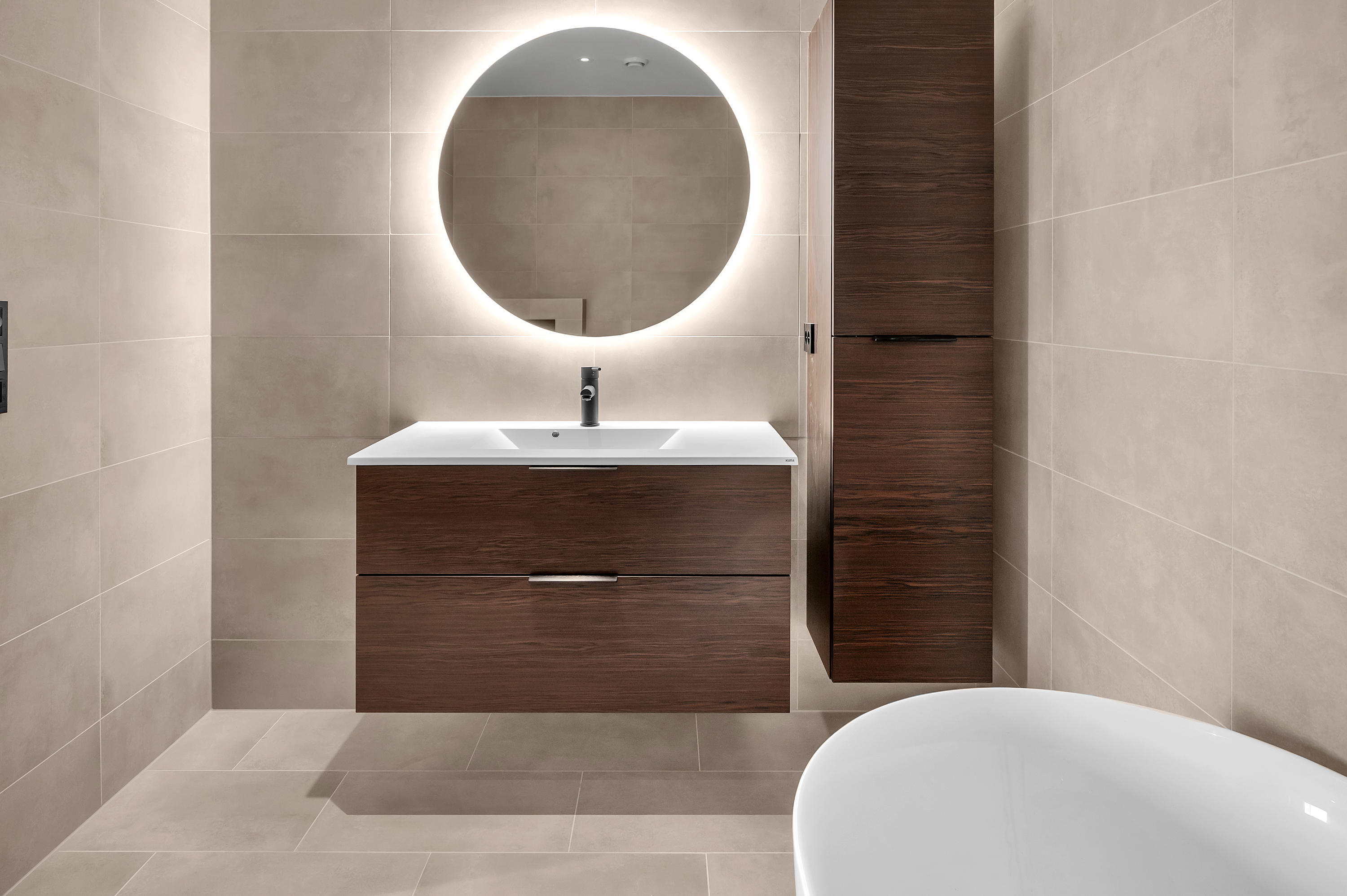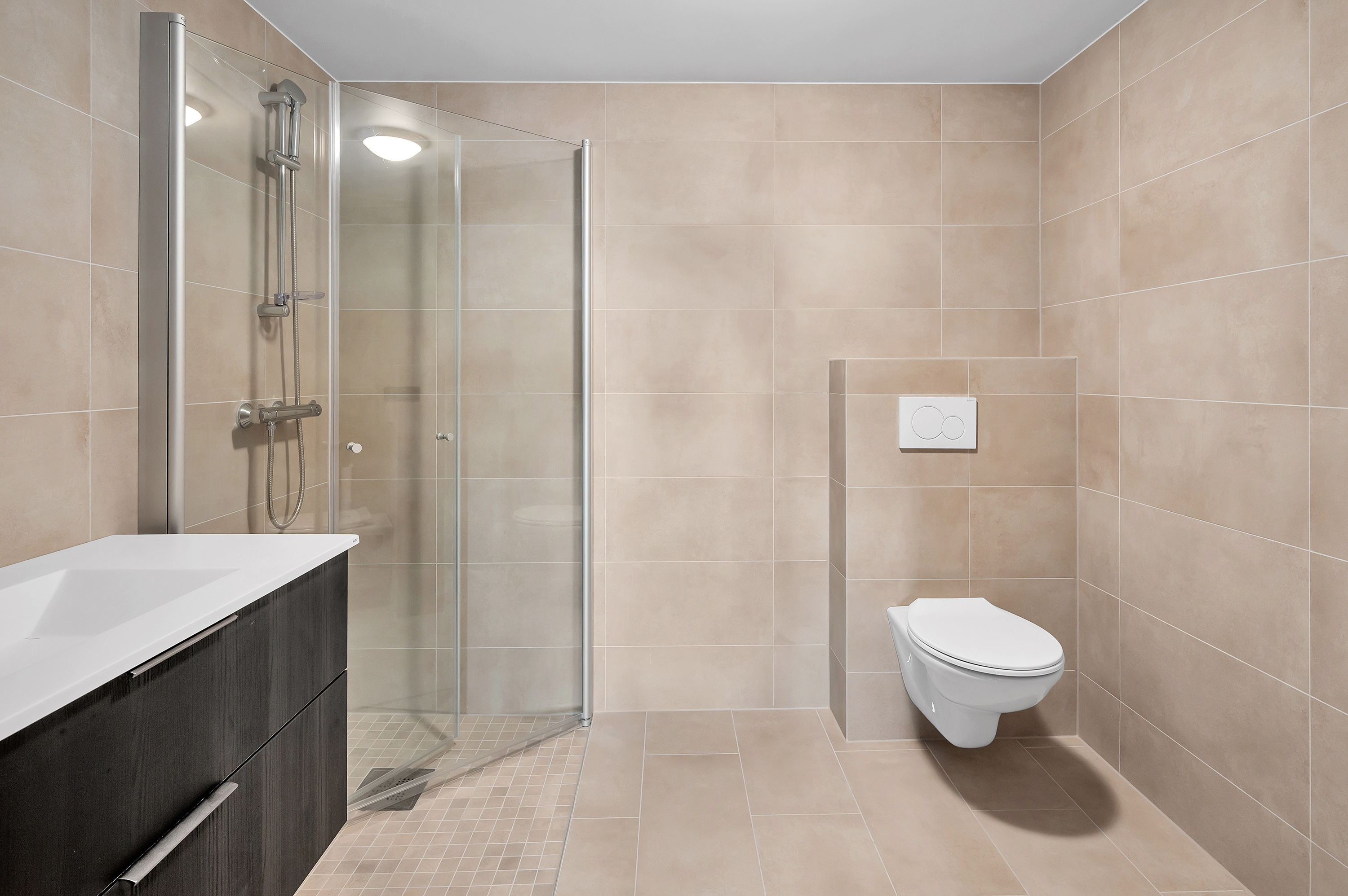 Baderomsinnredningen leveres av HTH med skuffeseksjon, nedfelt vask og speil med innfelt lys. Toalettet er vegghengt og dusjhjørnet leveres i herdet glass. Badet har varme i gulvet og både gulv og vegger er flislagt med delikate fliser.