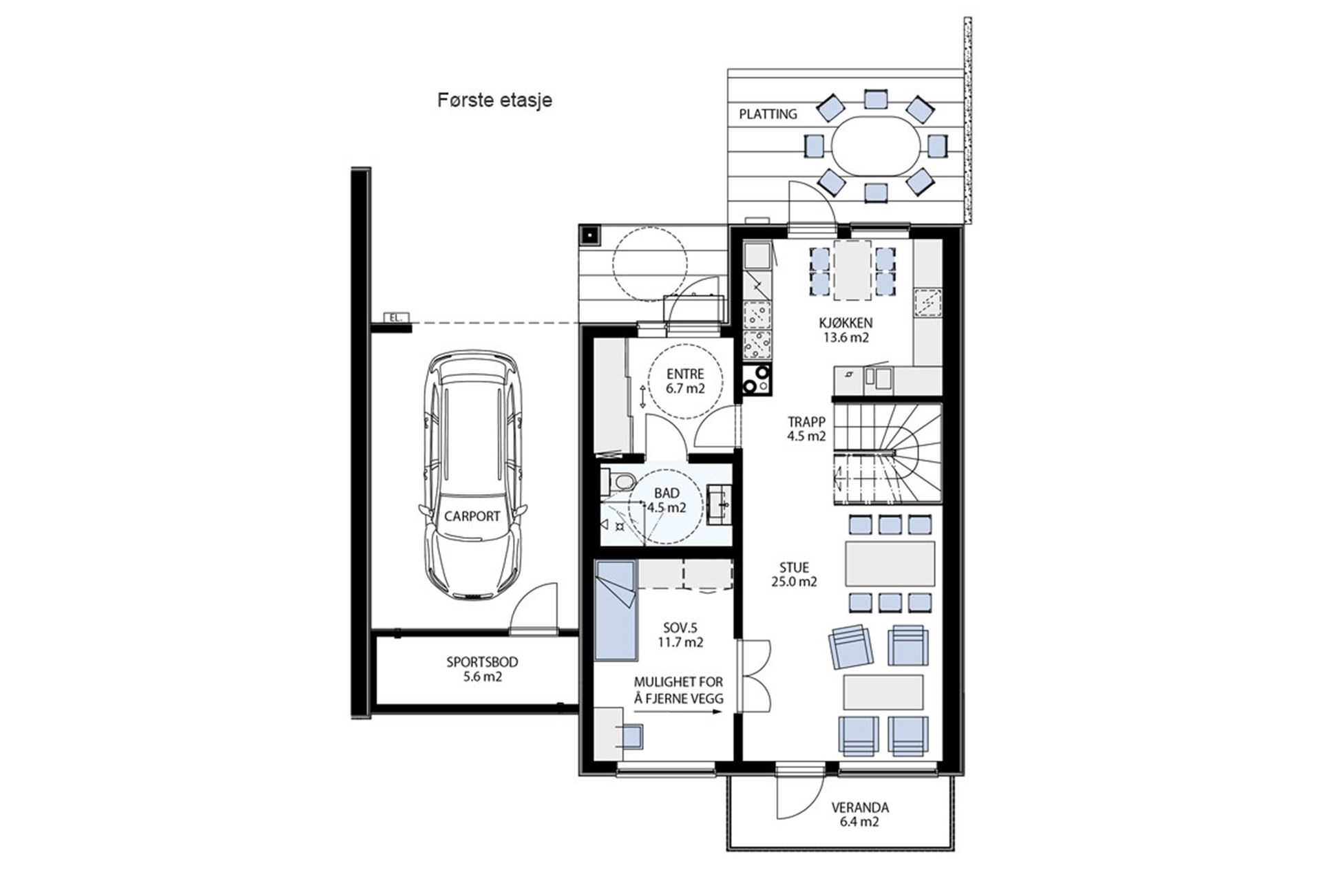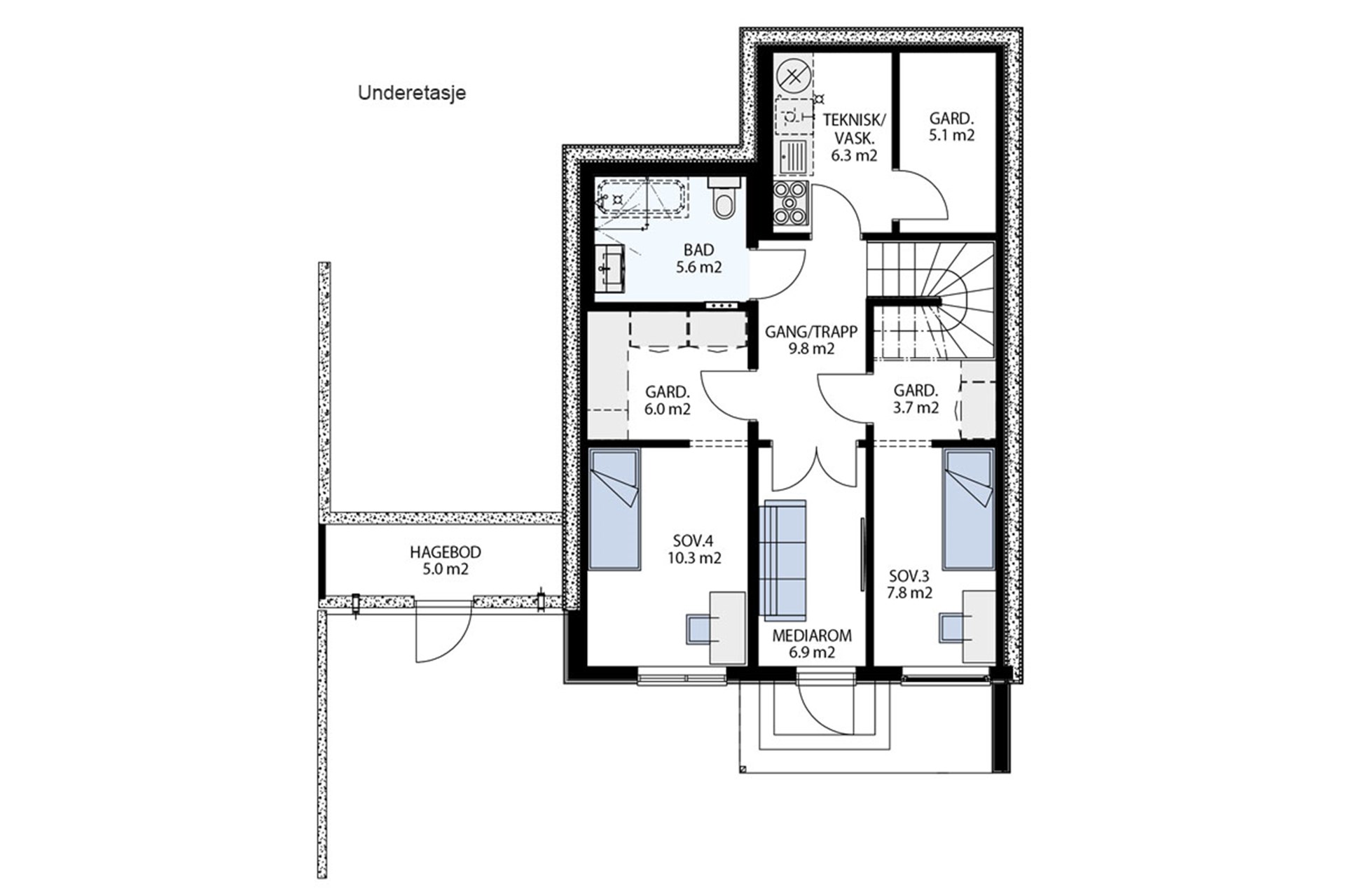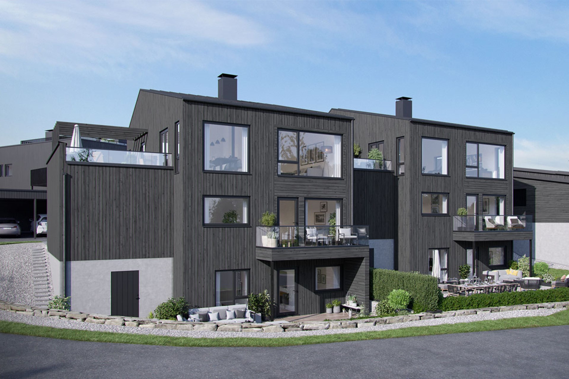 Disse boligene går over tre plan, og enkelte av dem vil ha en praktikantdel i underetasjen. De ordinære boligene består av entré, fem soverom (kan gjøres om til seks), tre bad, separat vaskerom, kjøkken, to stuer og gode oppbevarings muligheter. Du får markterrasse og veranda i hovedetasjen, og en fantastisk usjenert takterrasse i 2. etasje. Boligene vil også ha carport med sportsbod, hage, bod og en ferdig opparbeidet hage. Carporten kan om gjøres til en lukket garasje dersom det er ønskelig i tilvalgs-prosessen.