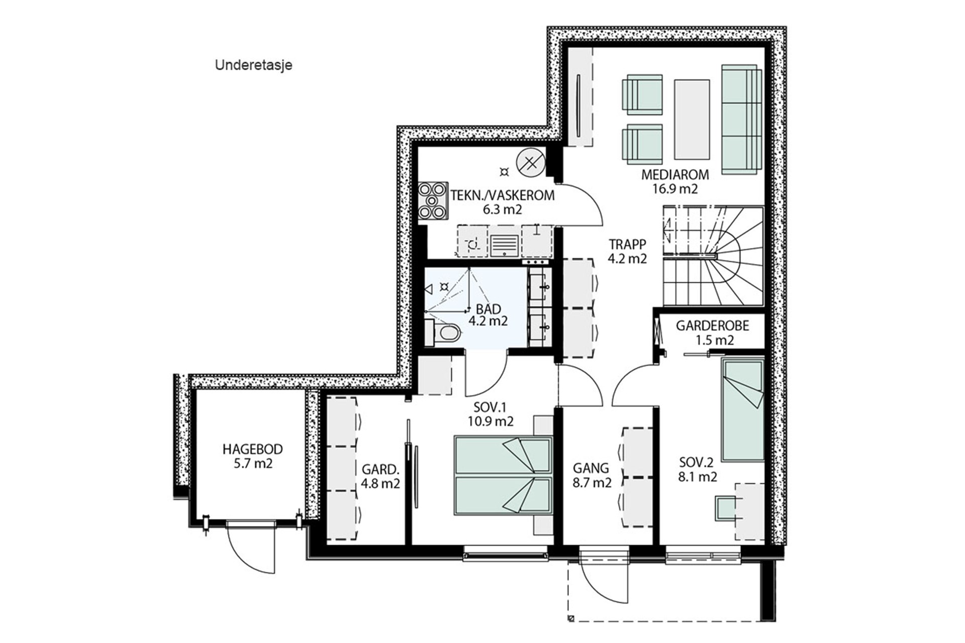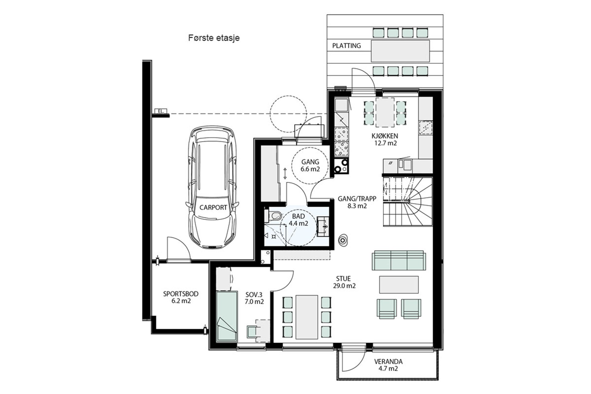 solfylt veranda. Tar du trappen ned vil du finne en tv-stue, to soverom med tilhørende garderober, hvor det ene også har et tilknyttet bad, og et separat vaskerom. I tillegg har etasjen en utgang til hagen med tilhørende utvendig redskapsbod. Boligen har også carport som kan omgjøres til garasje hvis ønskelig, samt en sportsbod i tilknytning til denne.