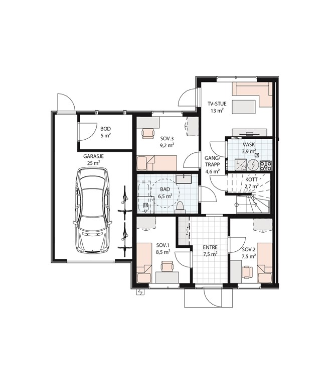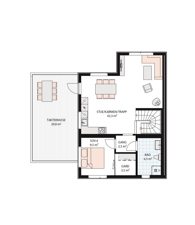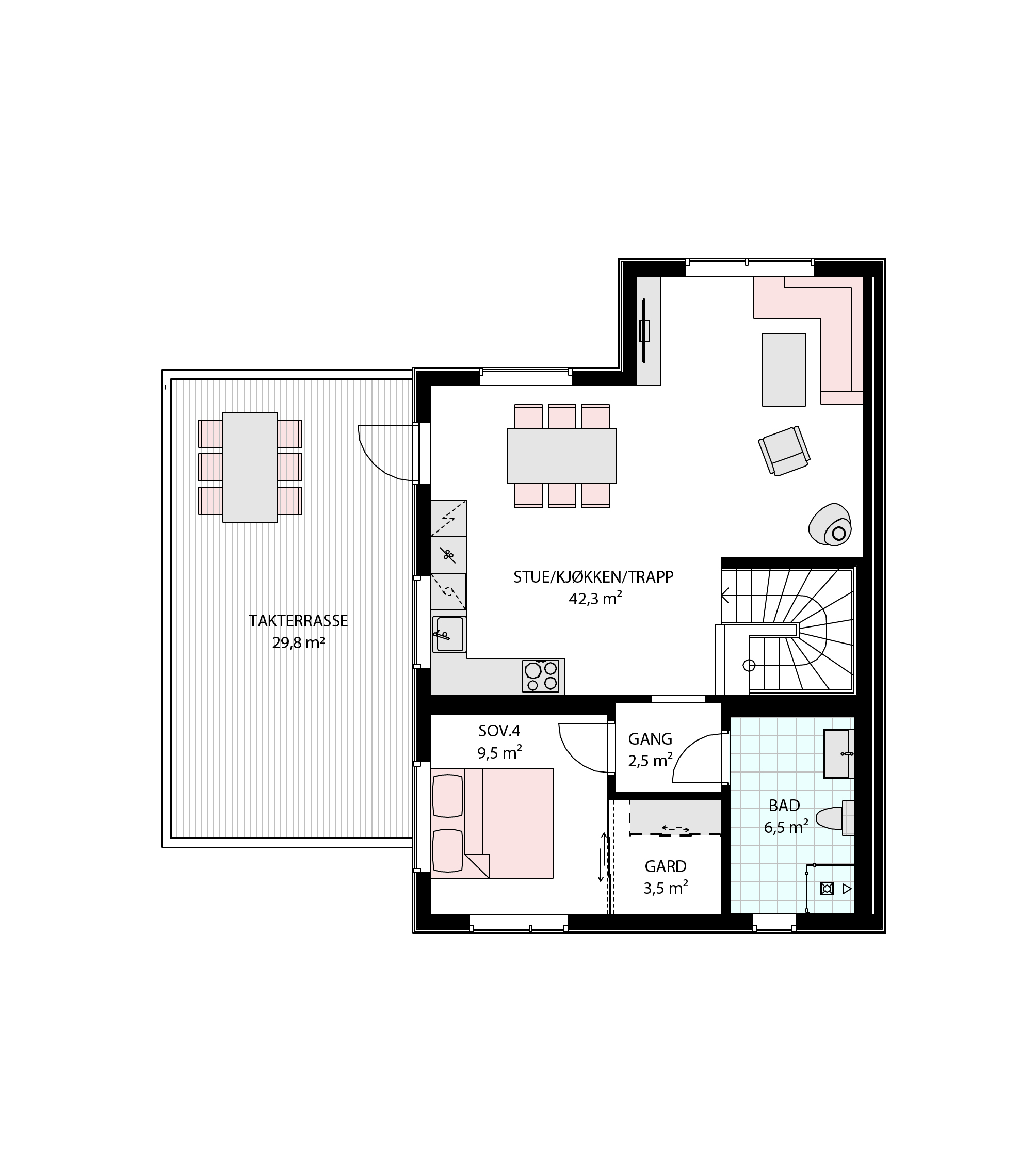 - Alle gulv i tørre rom leveres med 15 mm parkett