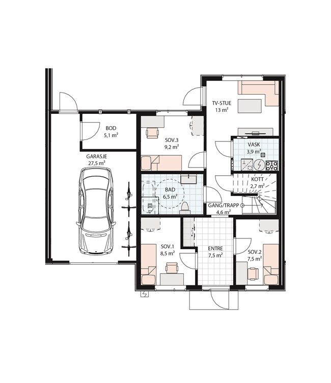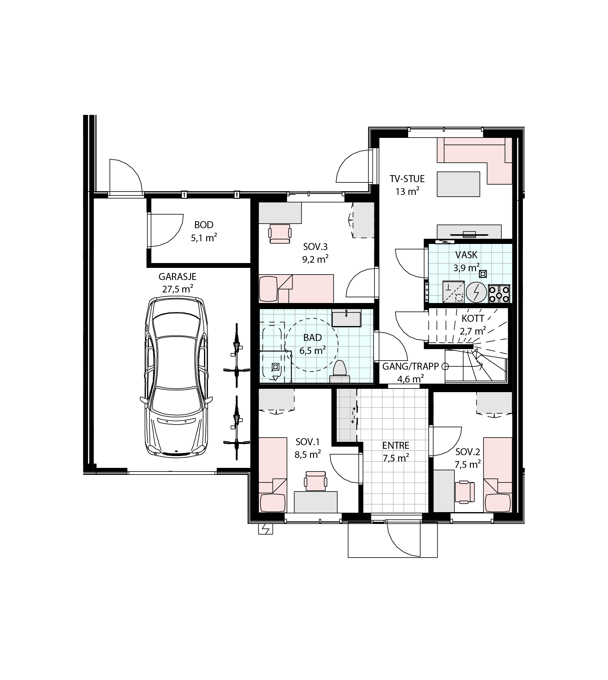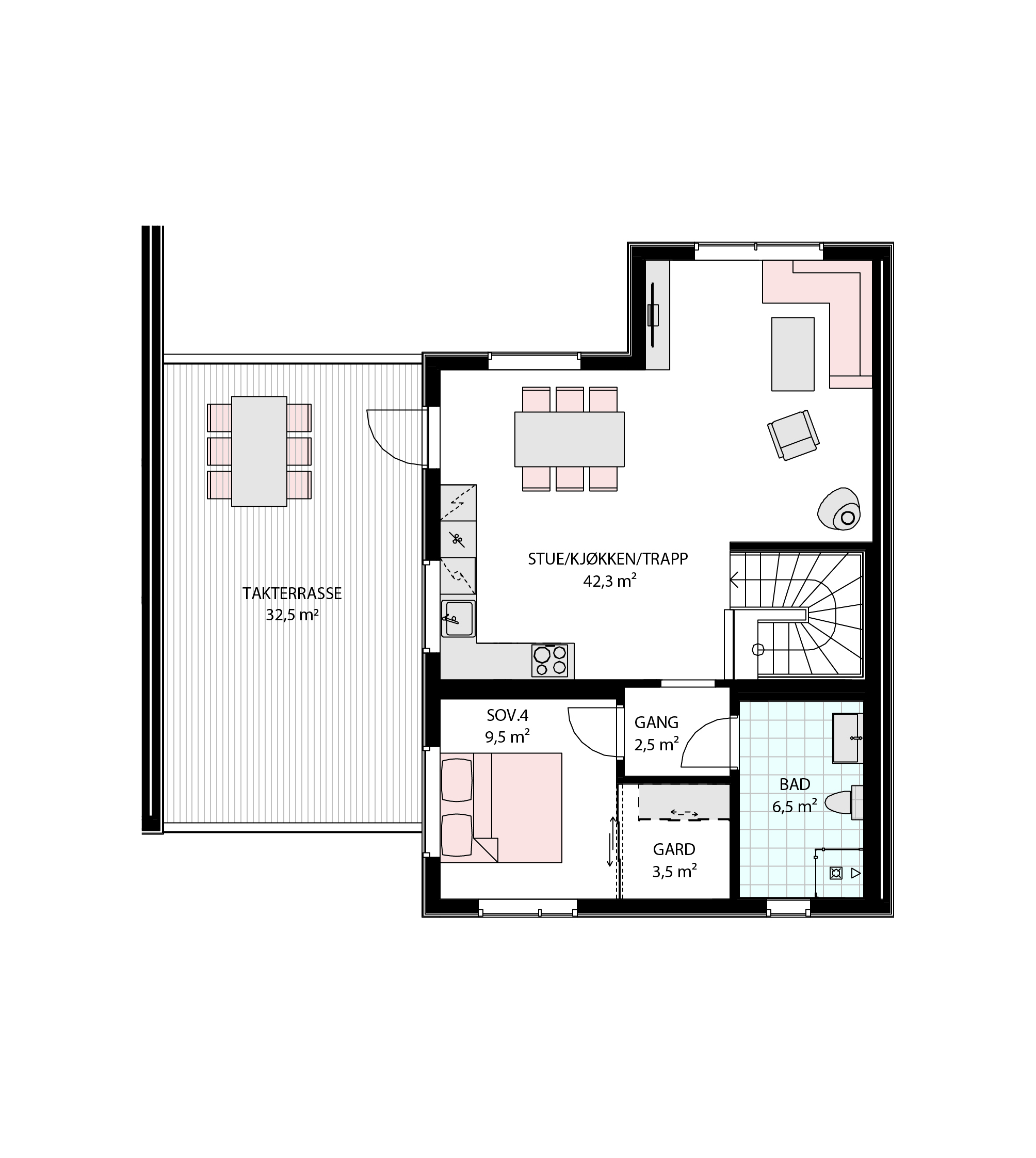 - Alle gulv i tørre rom leveres med 15 mm parkett