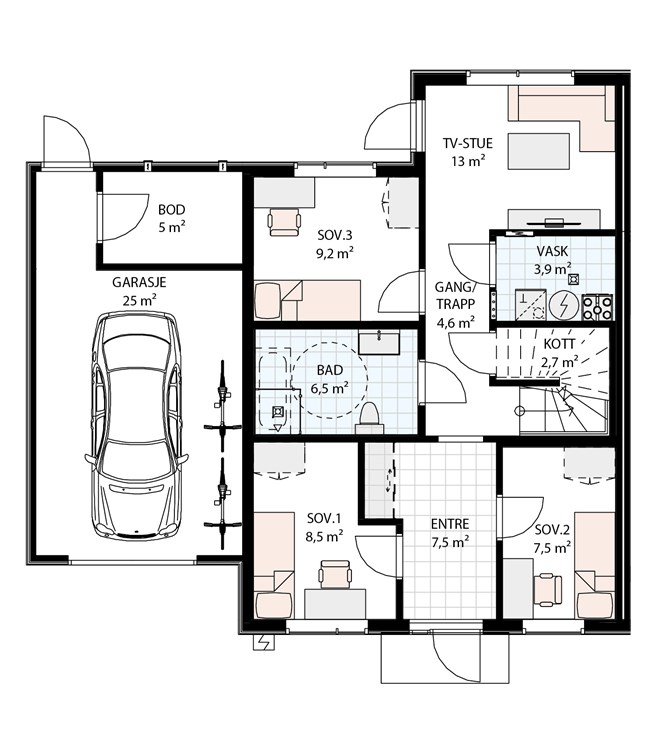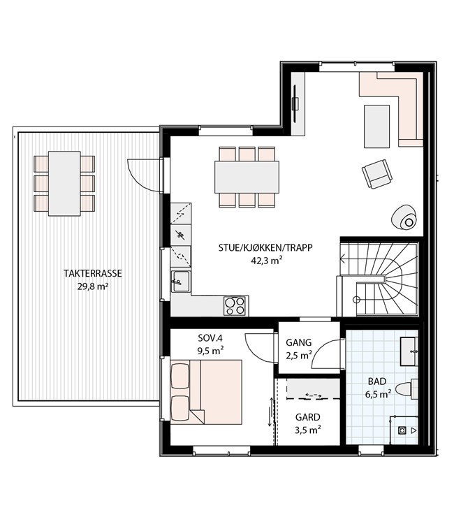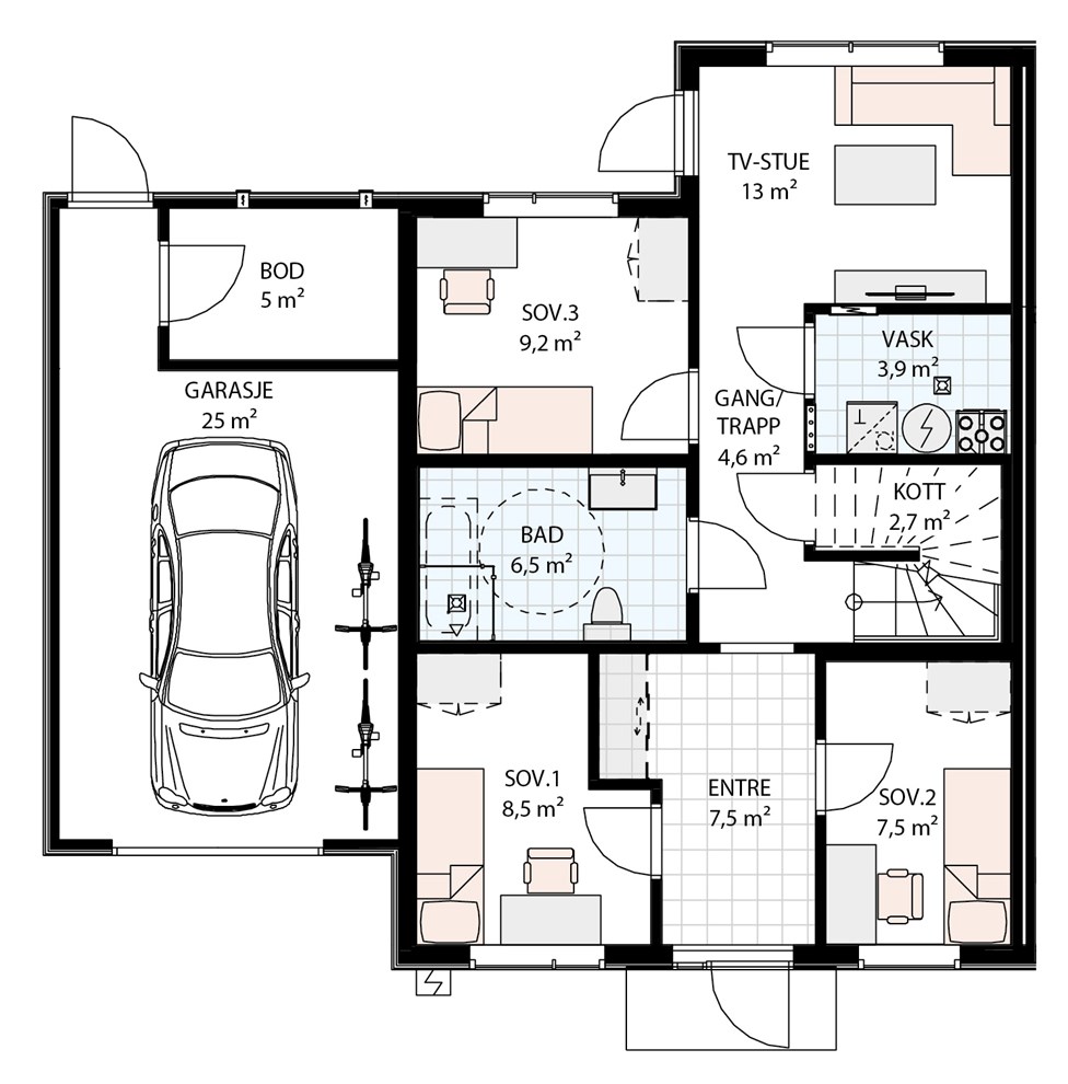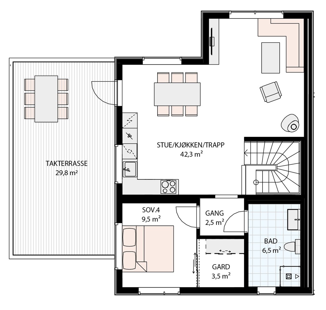 - Alle gulv i tørre rom leveres med 15 mm parkett