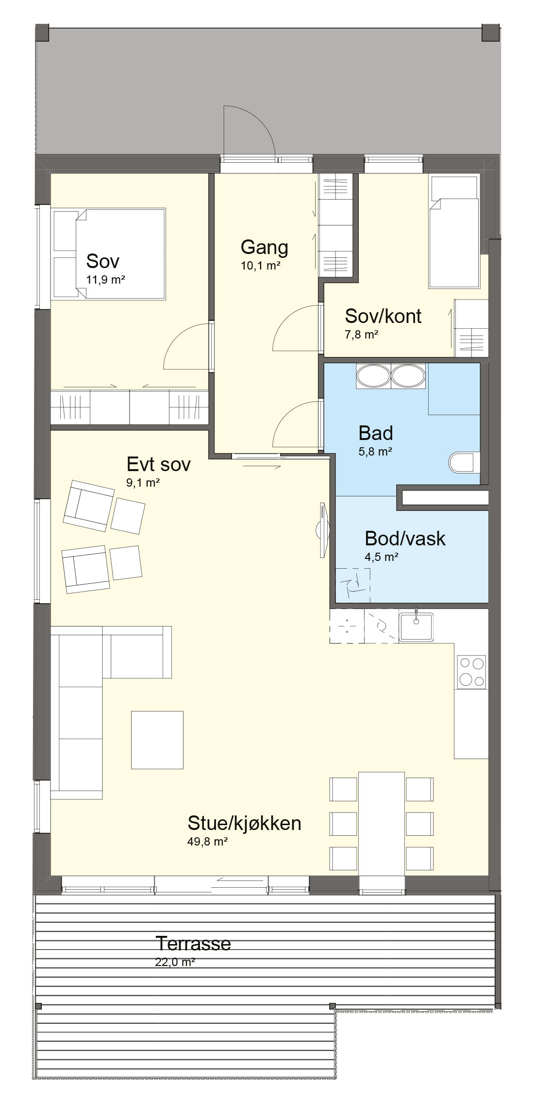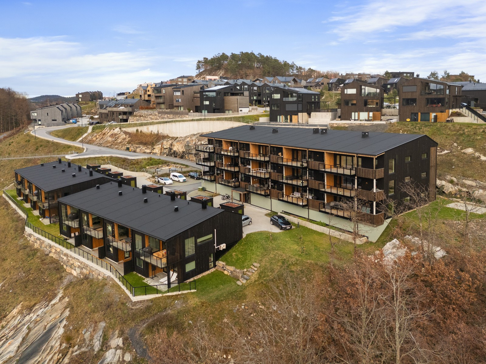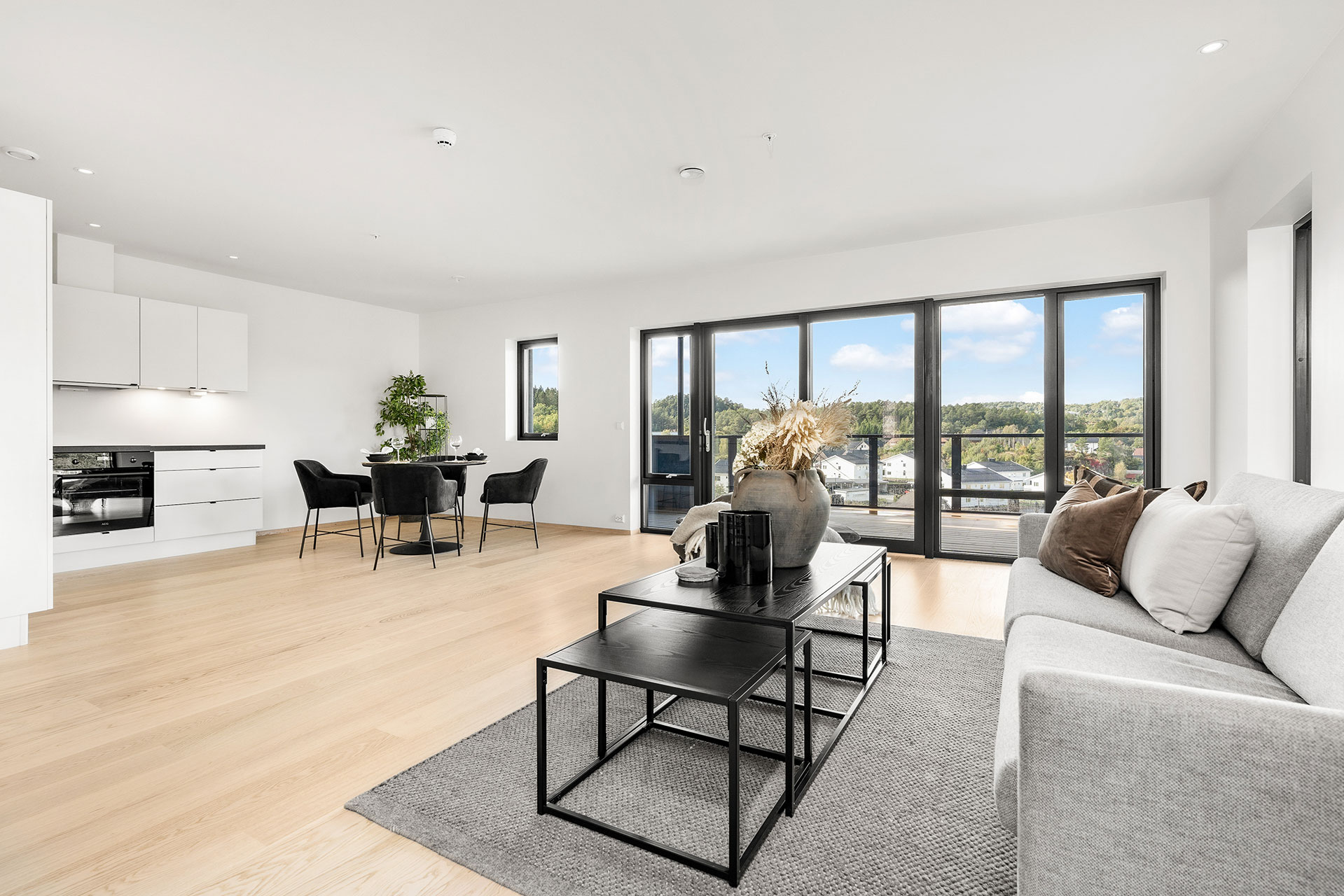 Det første som fanger oppmerksomheten når du kommer inn i leiligheten er den herlige utsikten. Den uberørte naturen former seg som en forlengelse av stuen og inviterer til sjelefred. Den gjennomtenkte soneinndelingen gjør at du kan utnytte boarealet på den måten du selv ønsker, med rom for rekreasjon og sosialt samvær. Det skal være enkelt å bo i en moderne leilighet, og det skal alltid være godt å komme hjem.