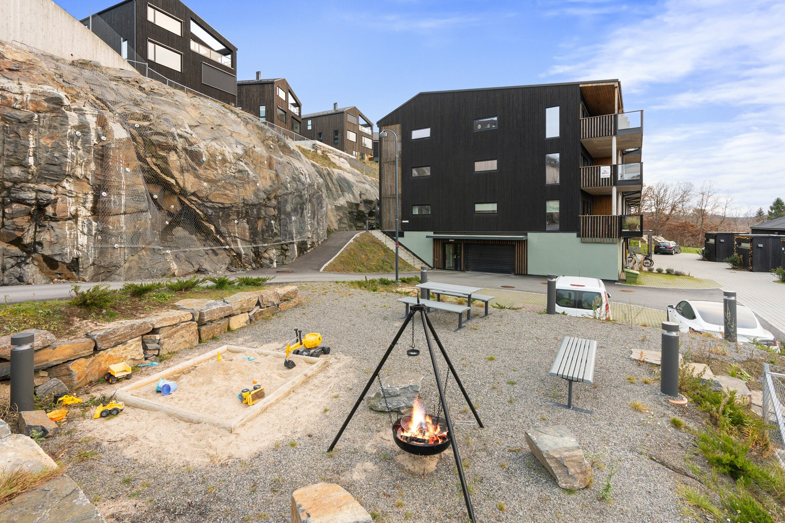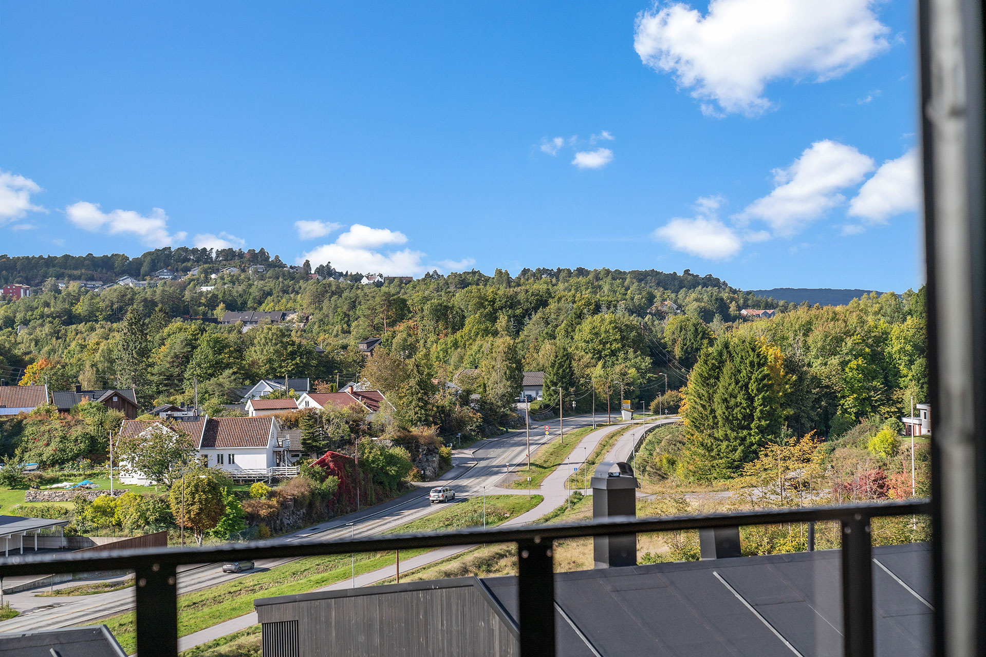 Deler av balkongen er skjermet for innsyn, og gir plass til en tilbaketrukket del av ditt eget uteområde. Du kan alltid nyte synet av den grønne åsen som breier seg ut, og danner en vakker ramme rundt området.
