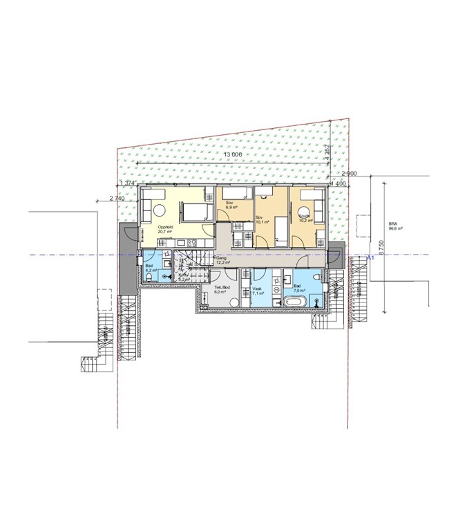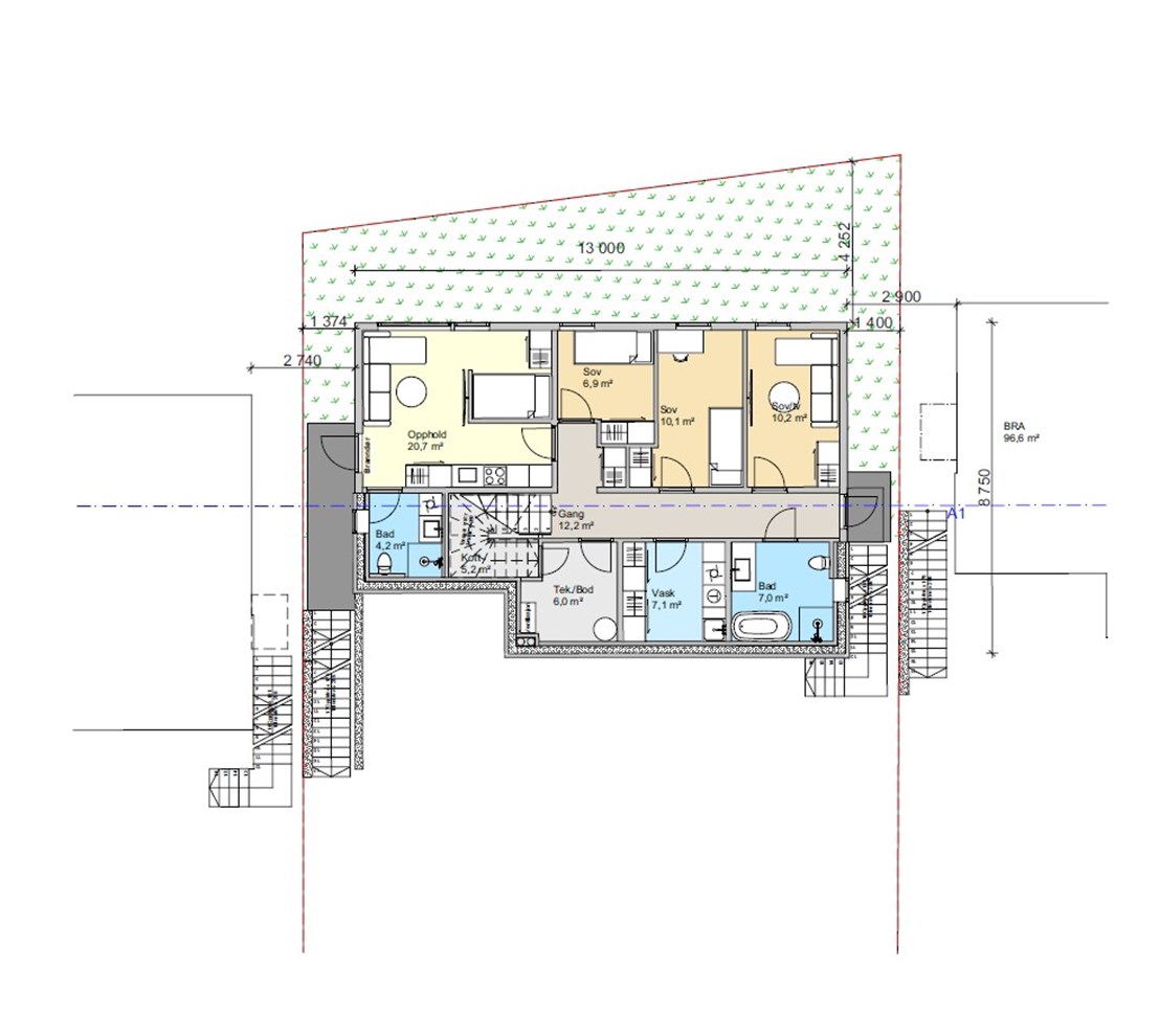 Her er det 3 soverom, stort bad, stort vaskerom og bod. I tillegg bygger vi også en hybel for skattefri inntekt. Du velger selvsagt selv om dette skal være kjellerstue, ekstra soverom eller for utleie. Vi leverer uansett lyd tiltak, kjøkken og bad til hybelen. Hybelen har egen utvendig trapp ned til u. etasje som gjør den veldig adskilt fra hoved bolig ved utleie. Hoved bolig har egen trapp på andre siden for å nå ned til sine uteareal uten å gå forbi hybel.