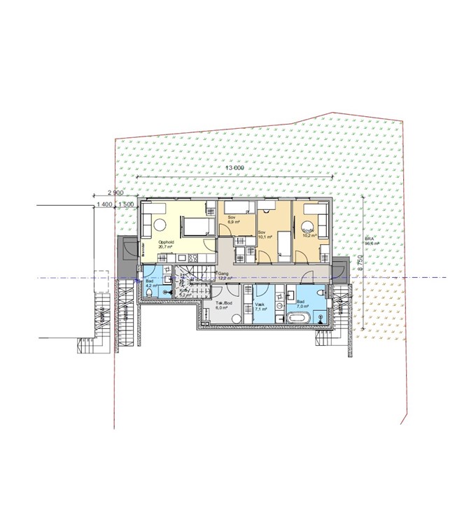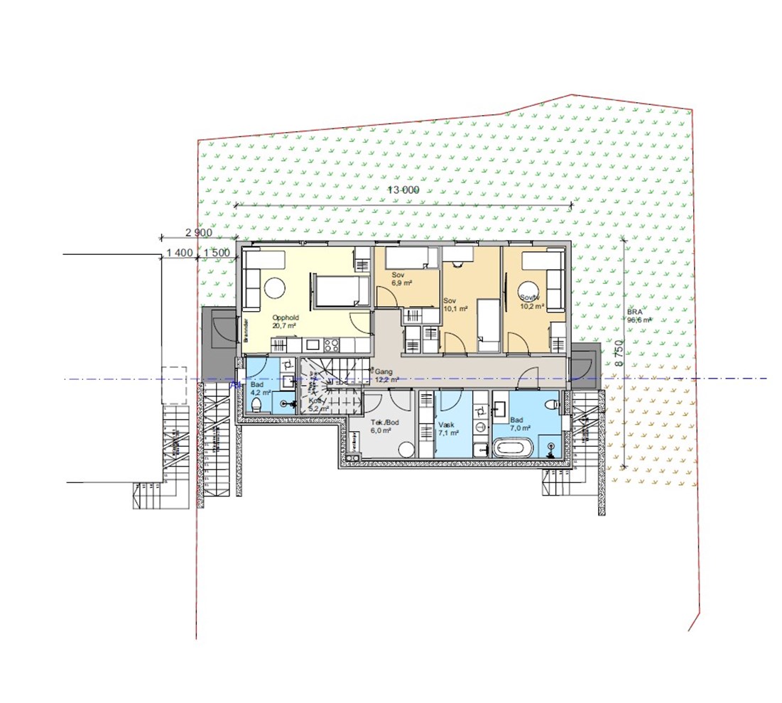 Her er det 3 soverom, stort bad, stort vaskerom og bod. I tillegg bygger vi også en hybel for skattefri inntekt. Du velger selvsagt selv om dette skal være kjellerstue, ekstra soverom eller for utleie. Vi leverer uansett lyd tiltak, kjøkken og bad til hybelen. Hybelen har egen utvendig trapp ned til u. etasje som gjør den veldig adskilt fra hoved bolig ved utleie. Hoved bolig har egen trapp på andre siden for å nå ned til sine uteareal uten å gå forbi hybel.