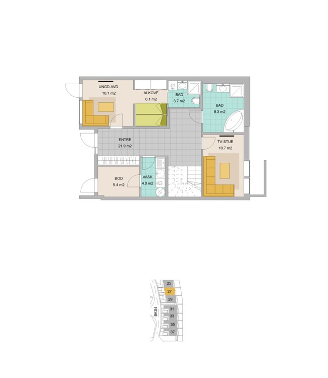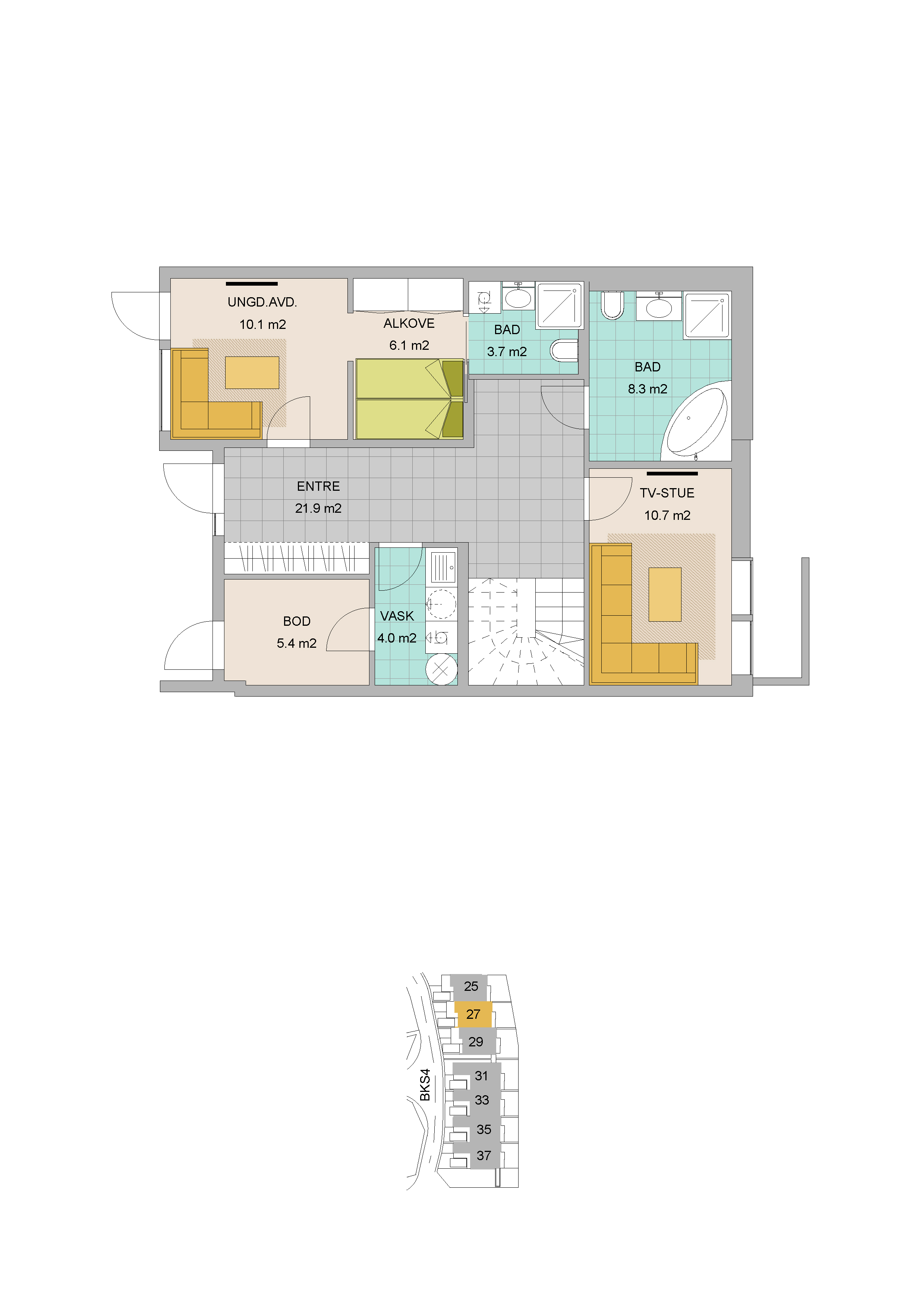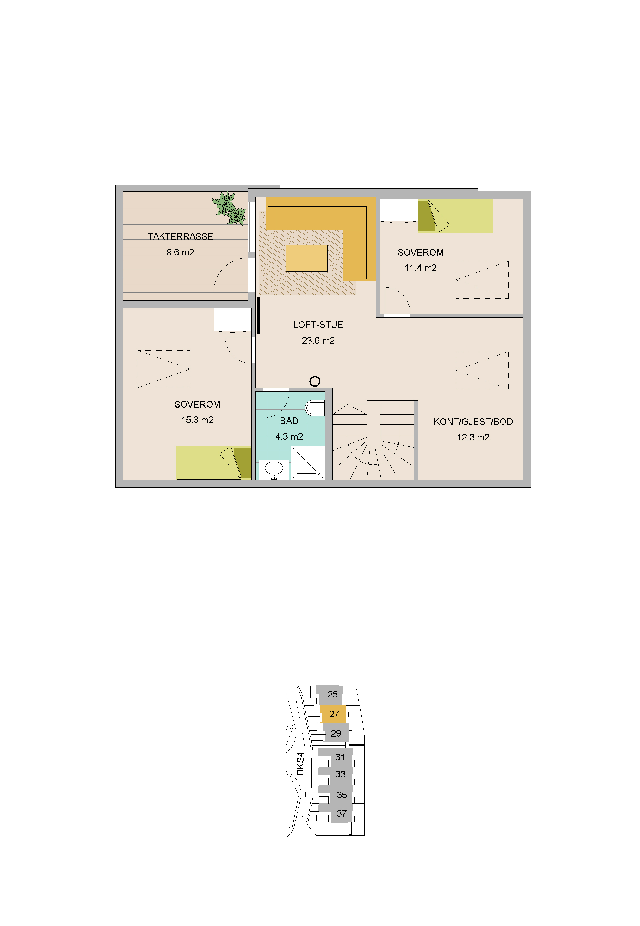 Dette er svært innholdsrike boliger, tegnet med øye for å best mulig utnytte tilgjengelig areal(BRA 200m2), samt uteplasser inne og ute tegnet med tanke på sol og opphold.