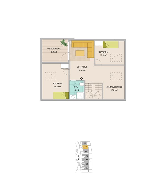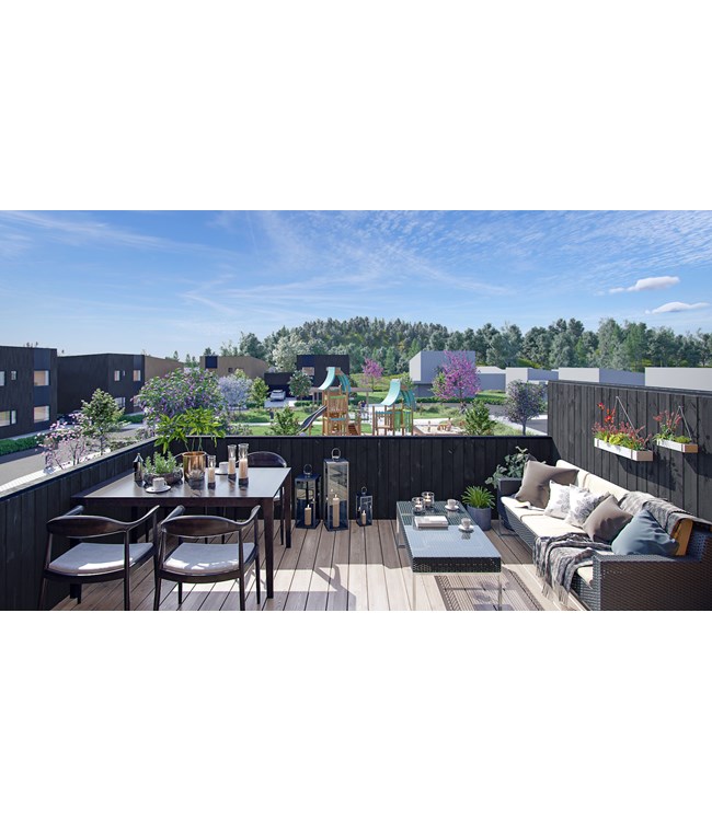 Vi har gleden av å presentere Sofiero 27, et rekkehus i 3 etasjer med hybel. Tegnet i felleskap av arkitekt Øyvind Flatnes og Knut Ove Kristiansen. Boligene ligger på en fin liten høyde og har sol fra morgen til kveld. Samtlige boliger bygges selveier tomt, og grenser til et felles tun med lekeplass.