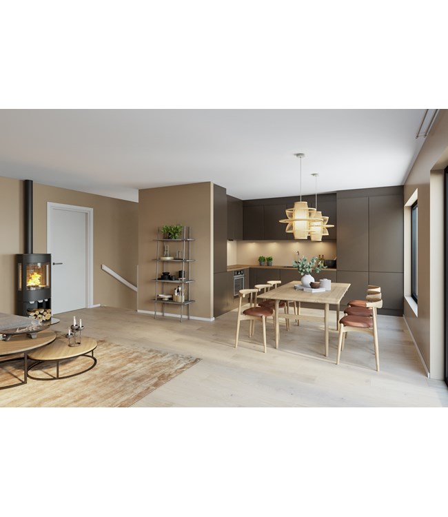 Inne leveres boligene ferdig med vår velkjente standard. Vi søker å tilby en tidsriktig leveranse som ikke skal kreve at du bruker penger på oppkjøp. Prospekt vil gi deg god innsikt, men vi leverer selvsagt gode laminat gulver, peisovn, belysning i alle rom, også mye downlights, utvendig belysning, god mengde kjøkken fra Strai kjøkken, lekre bader med dusjvegger og nedsenket gulv, eikedetaljer på fasade, vinduer med aluminiums beslag og mye mye mer!