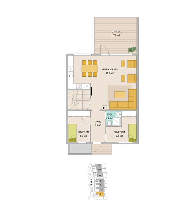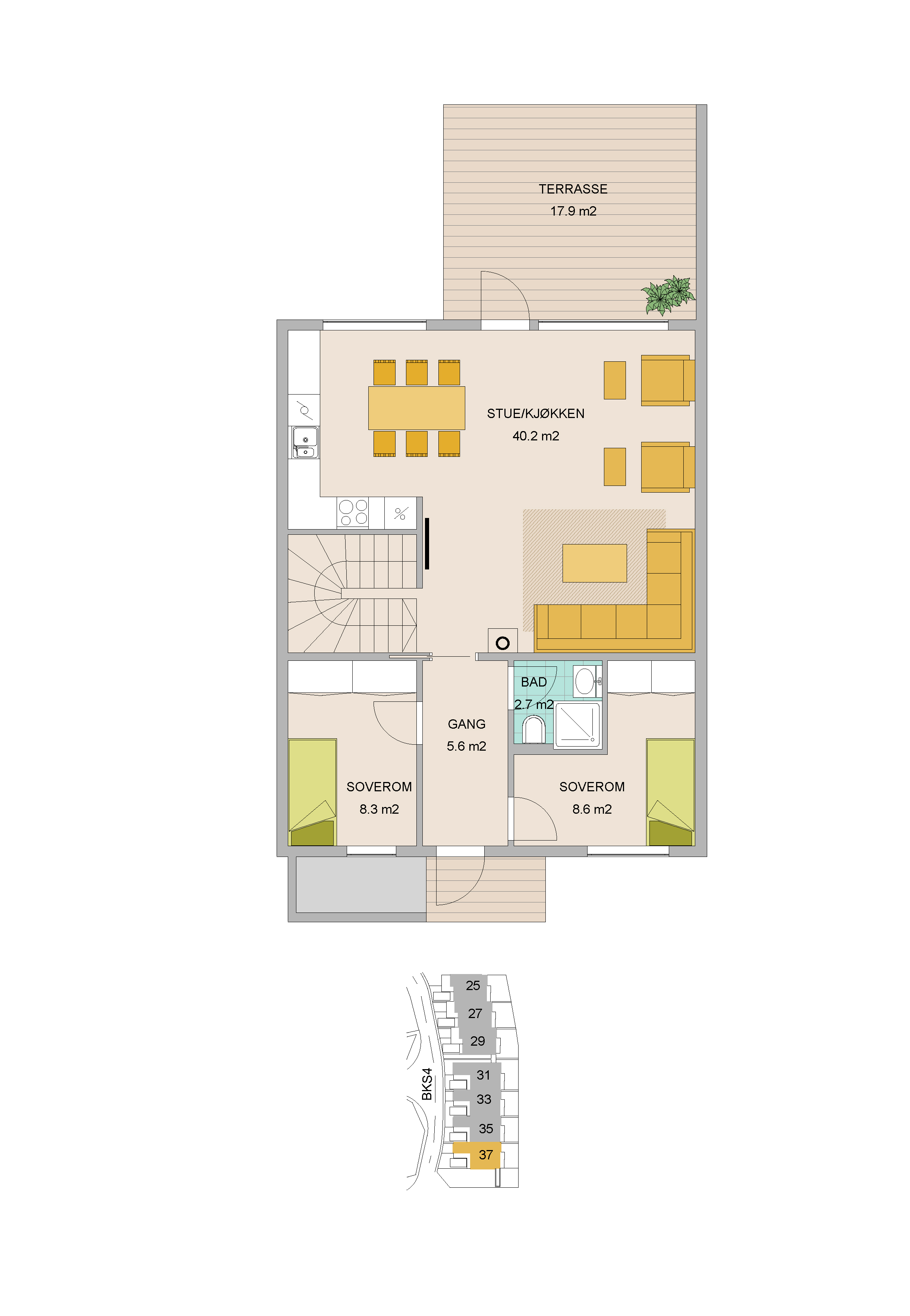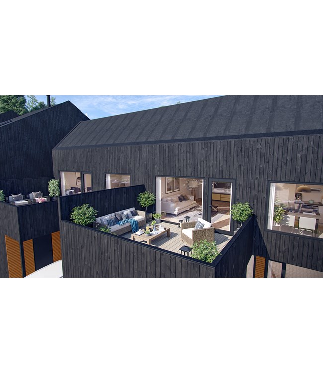 Dette er svært innholdsrike boliger, tegnet med øye for å best mulig utnytte tilgjengelig areal(BRA 152m2), samt uteplasser inne og ute tegnet med tanke på sol og opphold.
