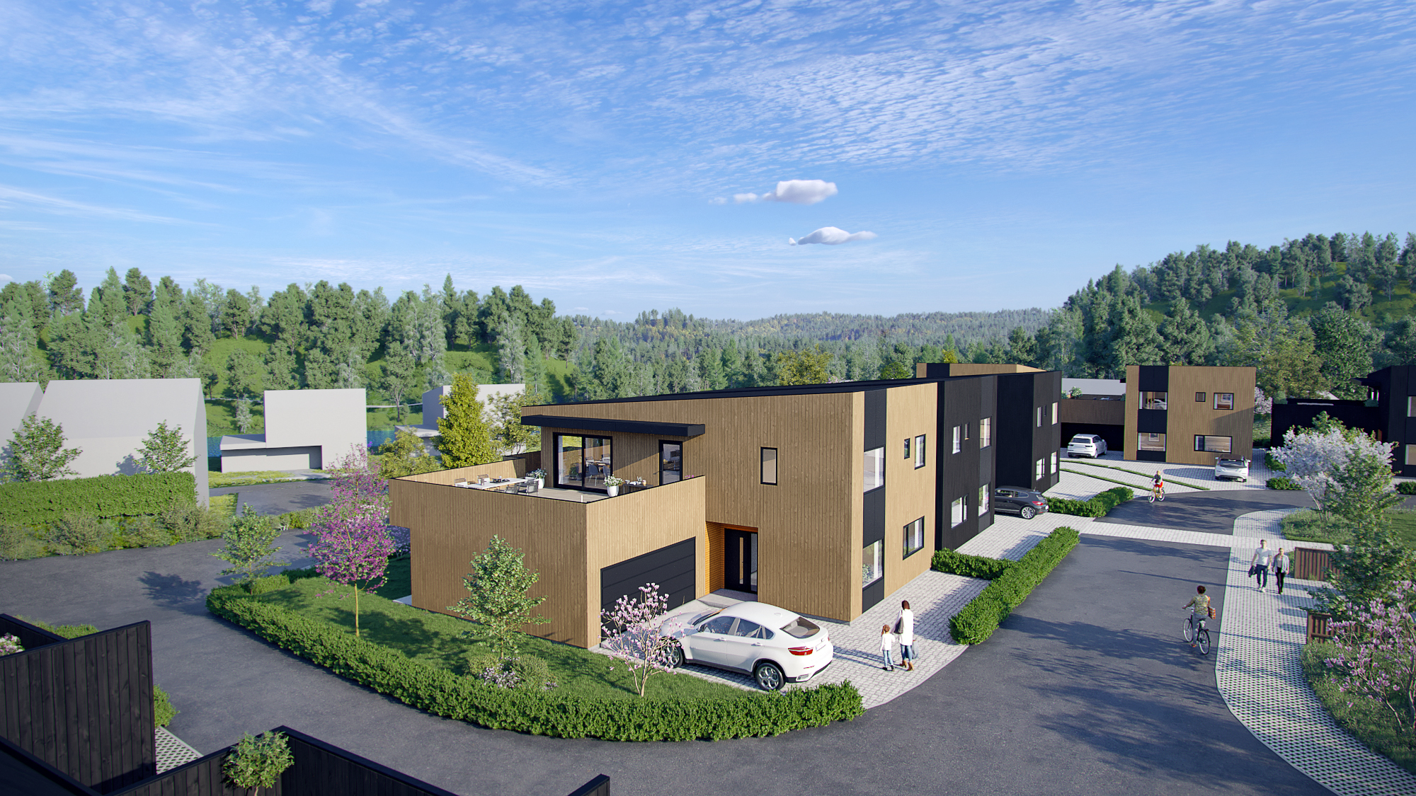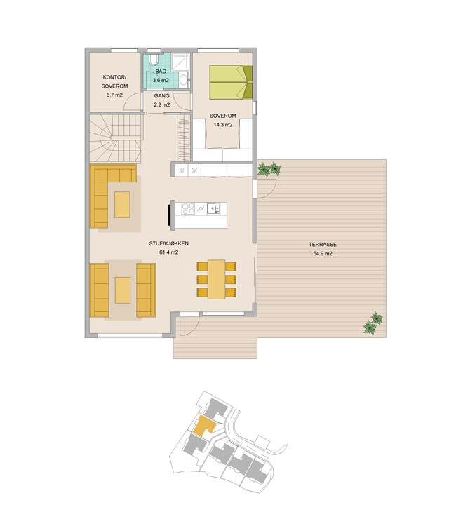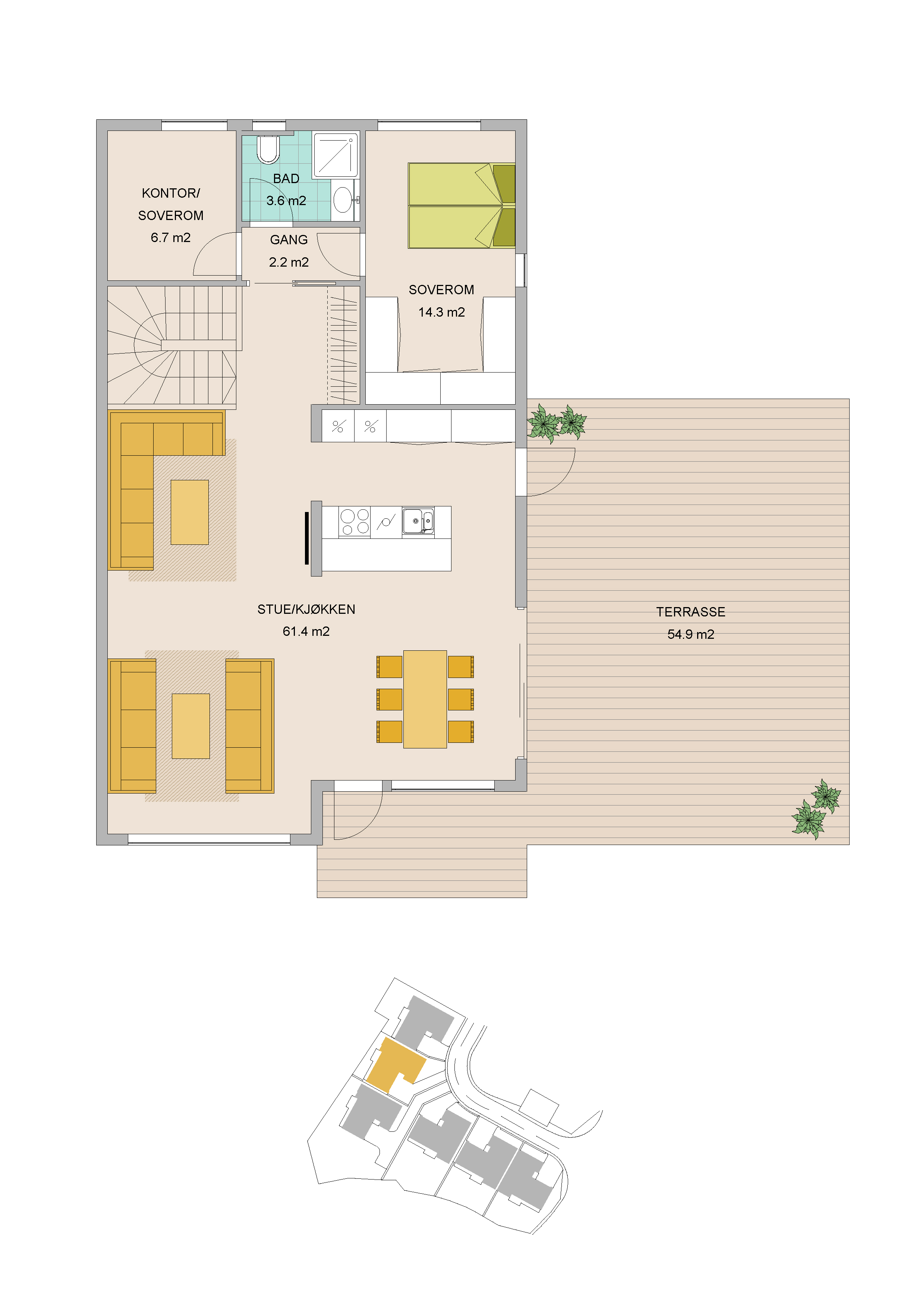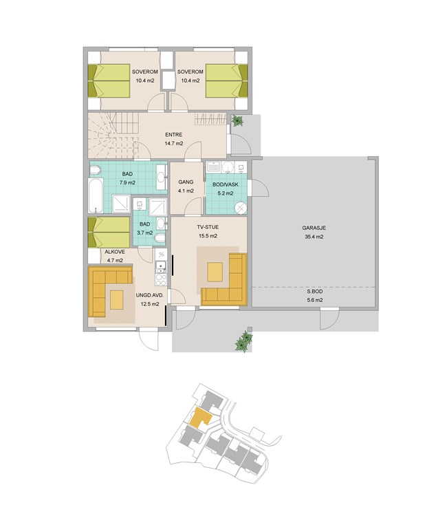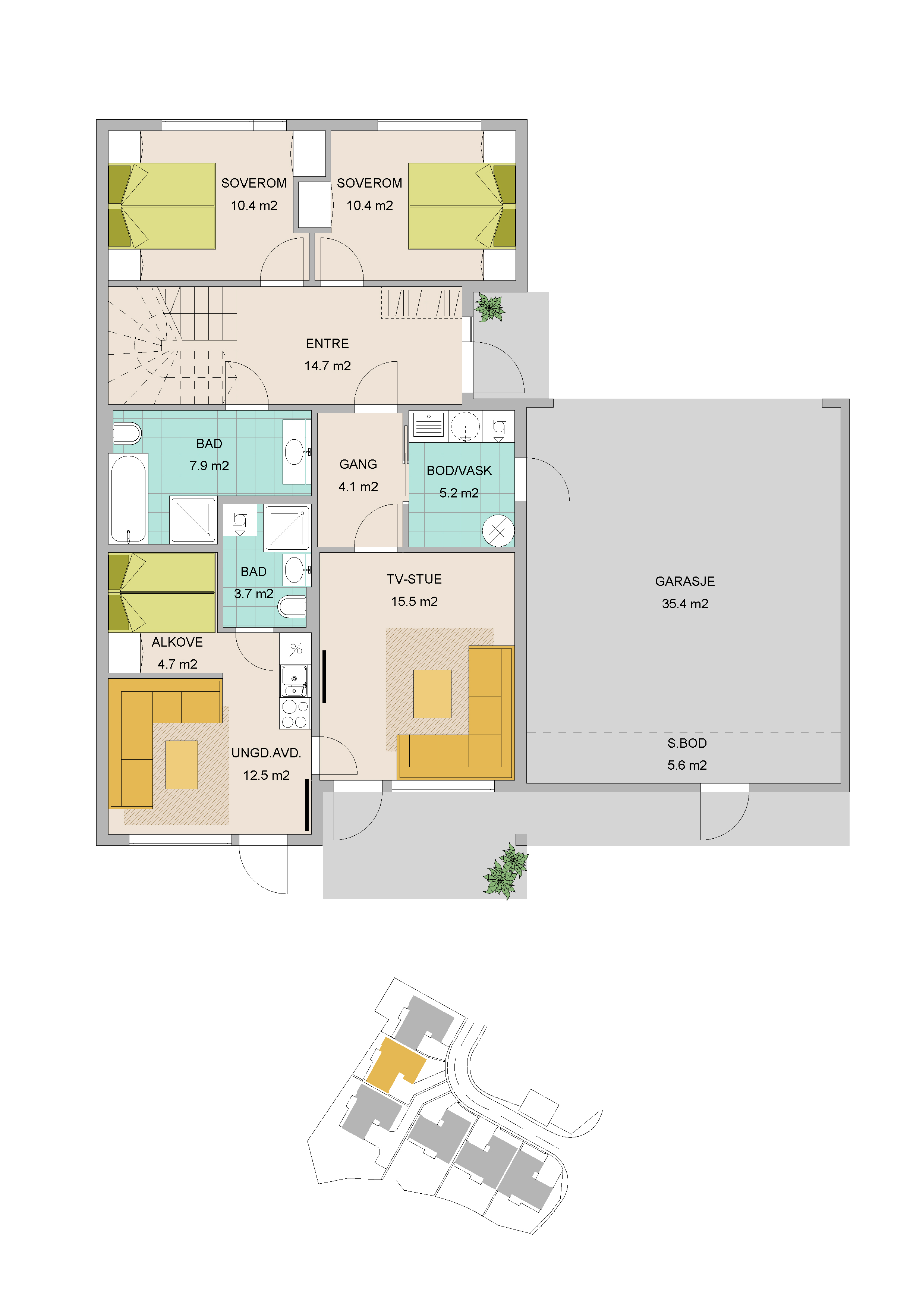 Dette er svært innholdsrike boliger, tegnet med øye for å best mulig utnytte tilgjengelig areal(BRA 230m2), samt uteplasser inne og ute tegnet med tanke på sol og opphold.