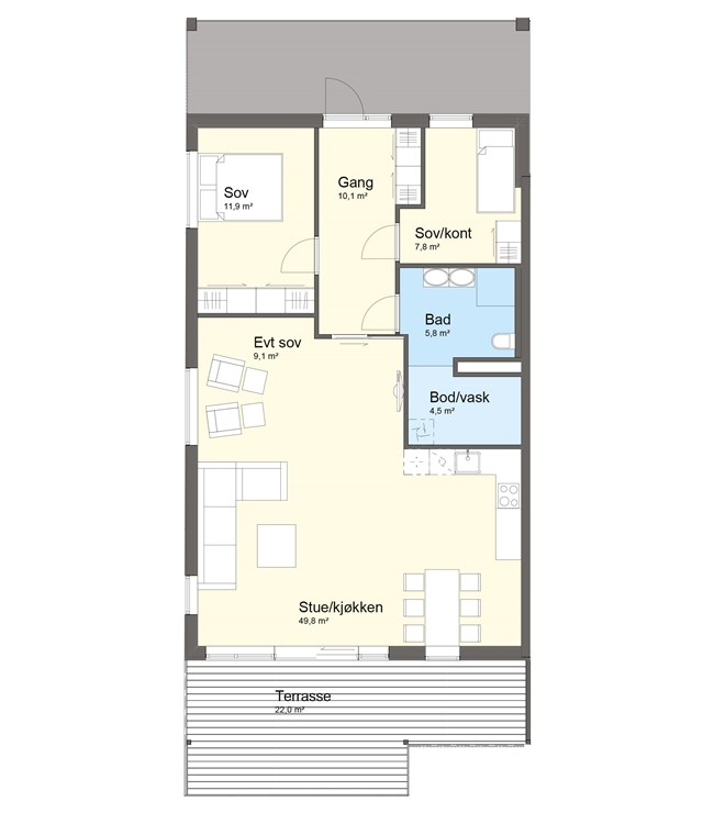 Det første som fanger oppmerksomheten når du kommer inn i leiligheten er den herlige utsikten. Den uberørte naturen former seg som en forlengelse av stuen og inviterer til sjelefred. Den gjennomtenkte soneinndelingen gjør at du kan utnytte boarealet på den måten du selv ønsker, med rom for rekreasjon og sosialt samvær. Det skal være enkelt å bo i en moderne leilighet, og det skal alltid være godt å komme hjem.