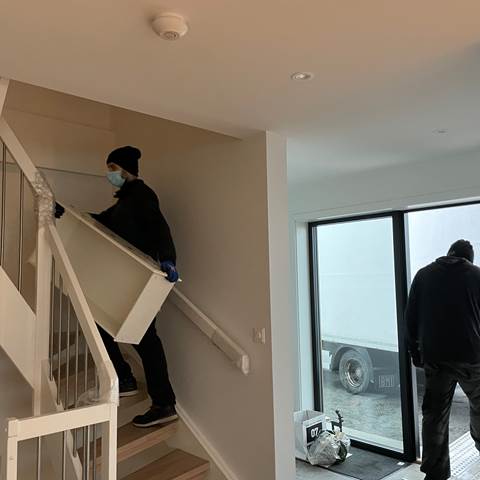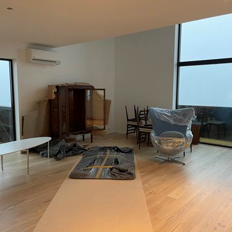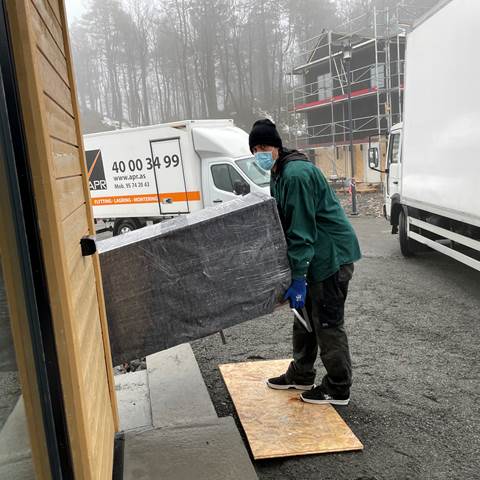 Da flyttebyrået APR kom med stæsjet vårt, var det bare å dirigere og vise vei til de ulike rommene der tingene skulle stå. APR hadde selv med 2 tepper som de la i inngangspartiet for å hindre at det skulle komme noe søl på gulvene. Og proffe som de var stilte de naturligvis med munnbind, selv om gjorde jobben vanskeligere. Jeg synes ganske synd på dem der de bar rundt på de tunge møblene våre, men de var seige og sterke og klagde ikke et øyeblikk. Eneste kommentar jeg fikk var at det var litt synd at trappene nå til dags var så smale. Og det er jeg jo enig i. Men de var superforsiktige og nøye, og tok ut alle skuffer fra kommodene som skulle i 2 etasje, og brakte dem opp en etter en. Tålmodige 👏