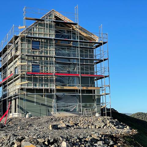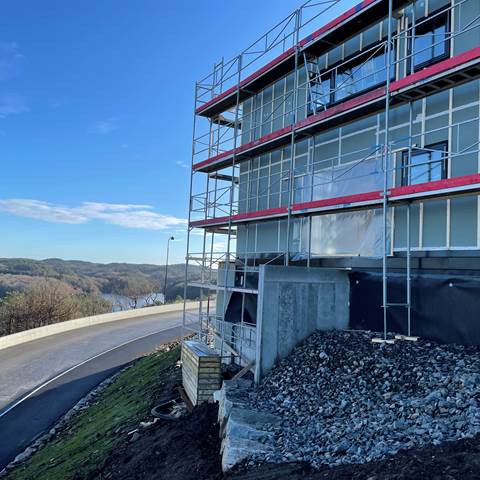 Til vår glede registrerte vi at de hadde fått lagt taket, samt at de fleste vinduene var satt inn. Noen vinduer gjenstår enda, spesielt de store, men de er nå i hvert fall tildekket med plast og tapet igjen. De har også startet med å legge noe av kledningen på den ene siden av boligen.