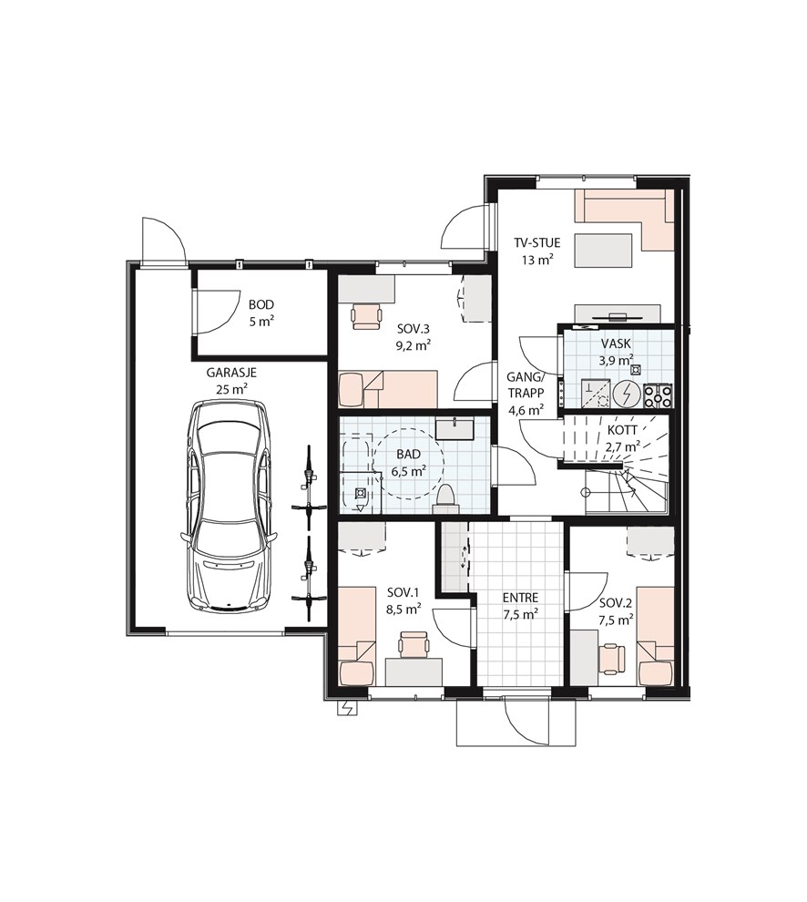 - Alle gulv i tørre rom leveres med 15 mm parkett