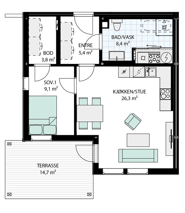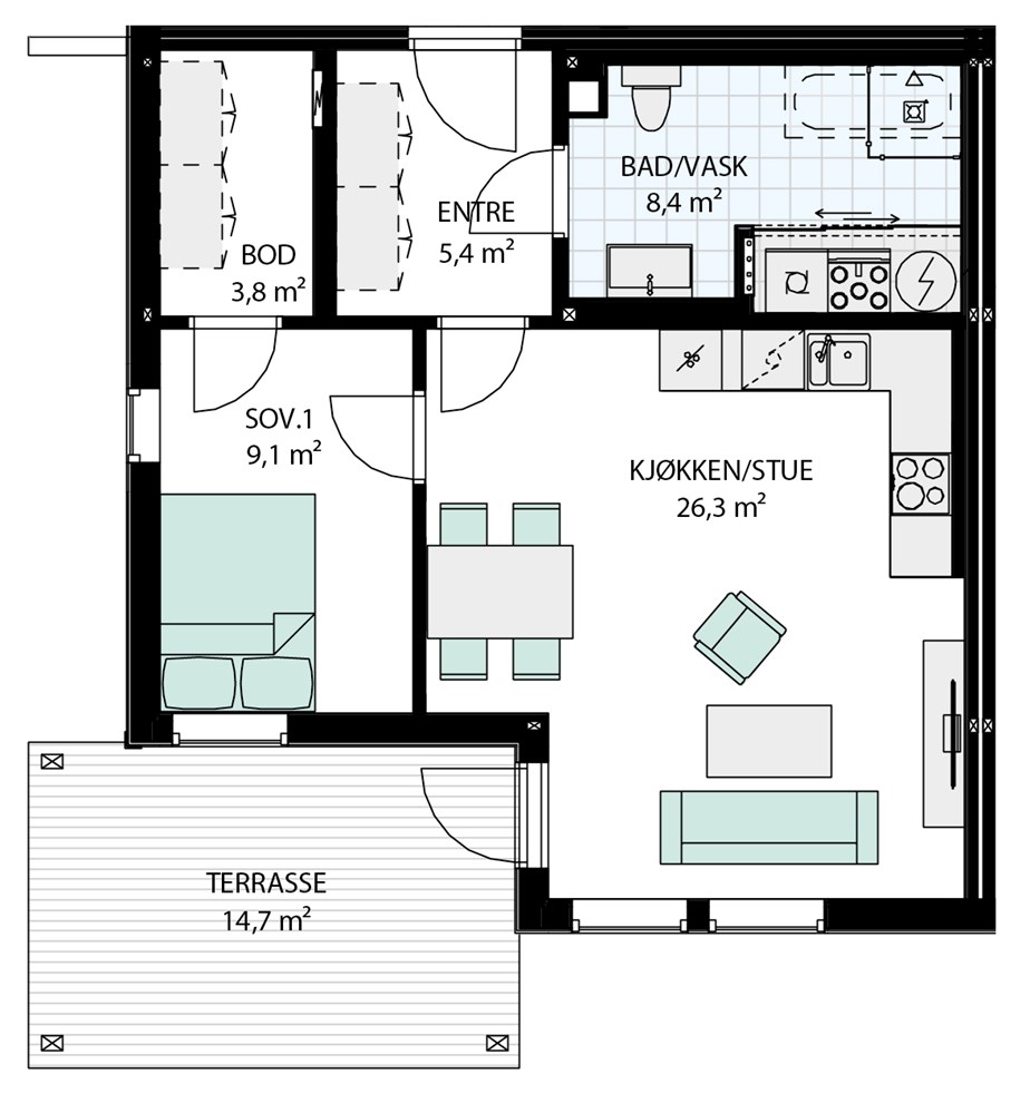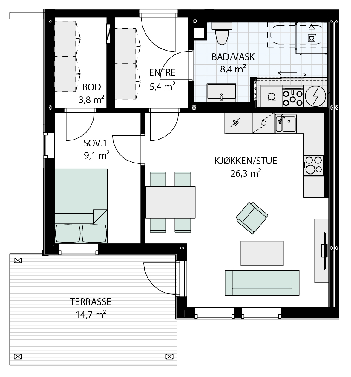 Leilighetene kommer i ulike størrelser fra ca. 62-96 kvm BRA.