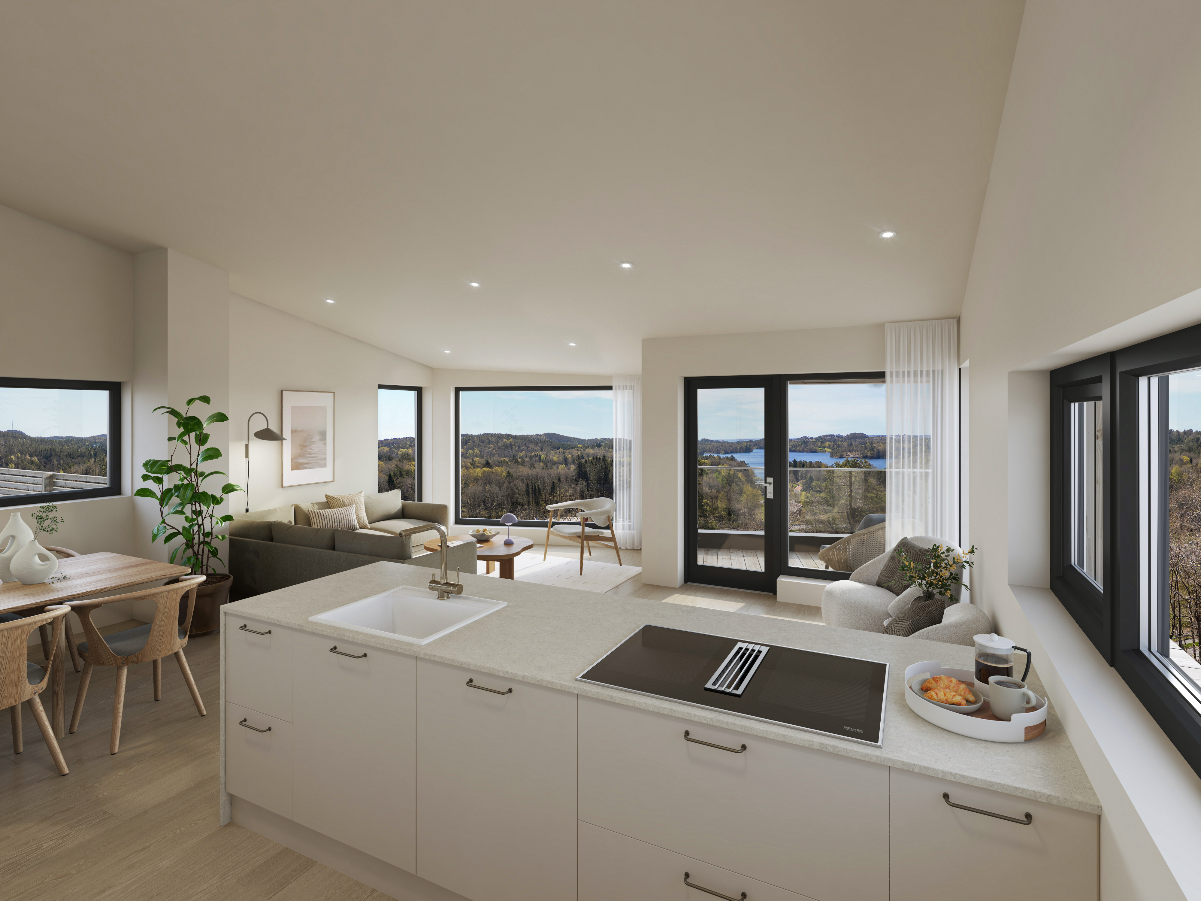 Innvendig møtes du av en lys og moderne stil med eikeparkett (U9Q Floor Eco Wood), malte flater i delikate og harmoniske farger og oppgradert belysning som løfter romfølelsen. De store vindusflatene slipper inn rikelig med naturlig lys og sørger for at utsikten virkelig får spille hovedrollen.