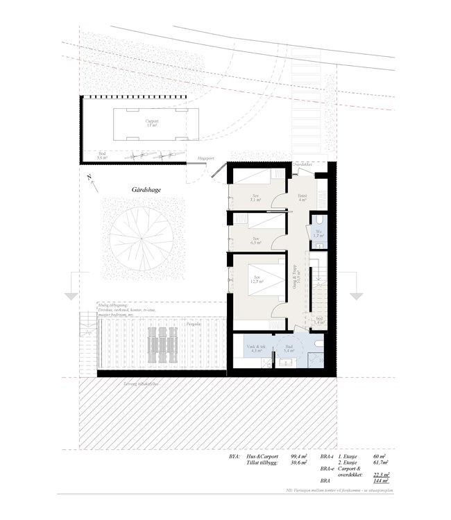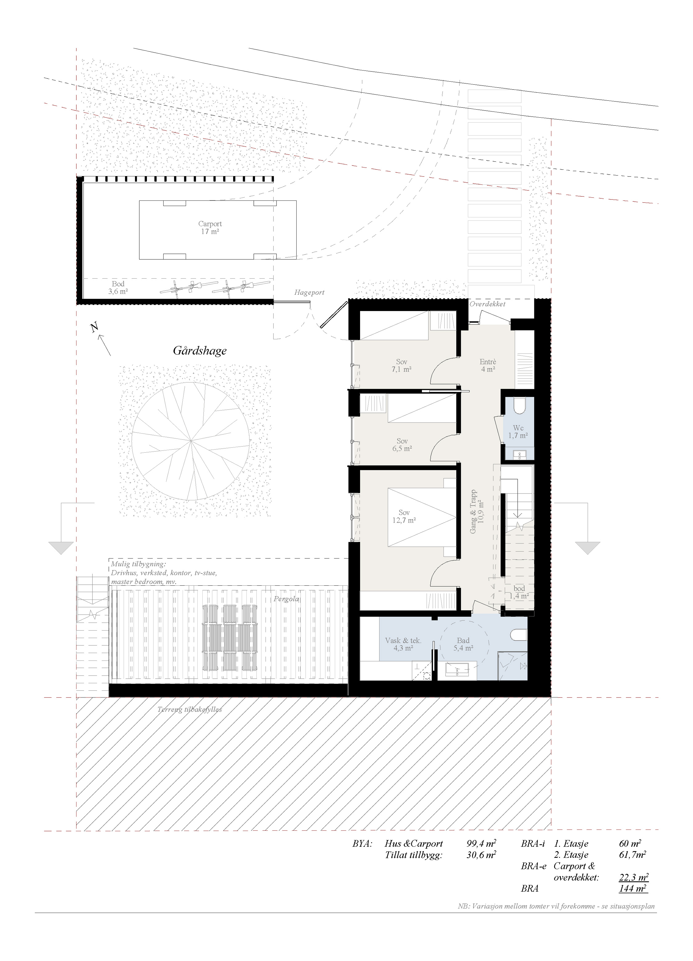 Meget arealeffektive atriumhus med mulighet for utvidelse! Boligene får inn uteområde på en naturlig og innbydende måte! Bolig over to etasjer med svært flott stue/ kjøkken etasje!